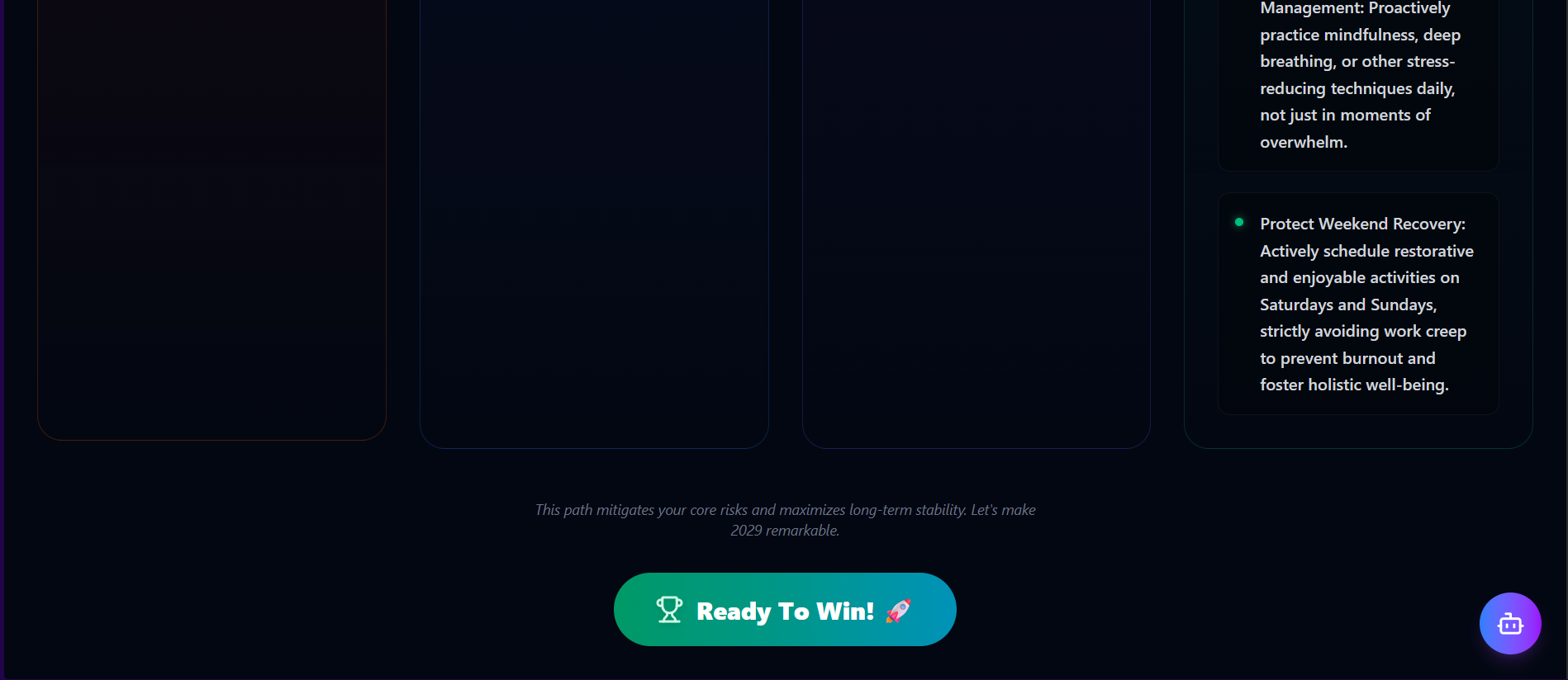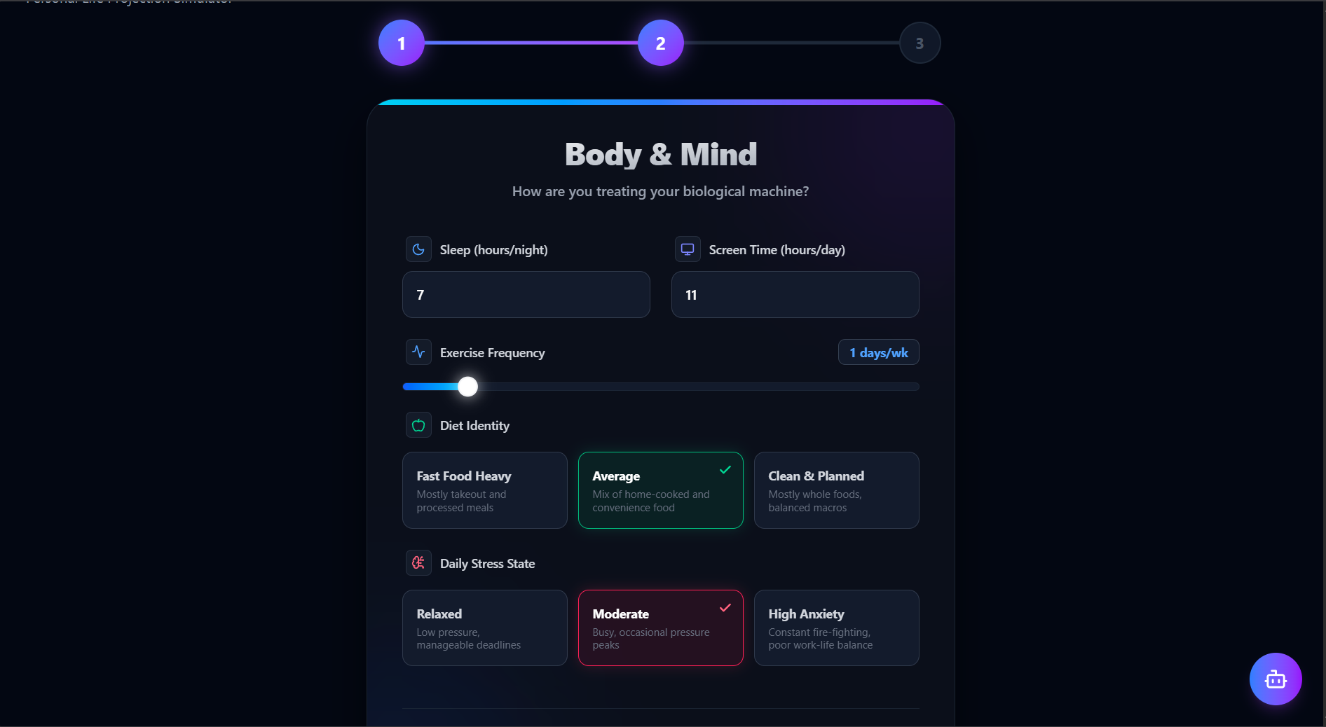 - Instant Scenario Comparison: Toggle "Improved Habits" to instantly see how tiny changes transform your Health, Wealth, and Burnout Risk.