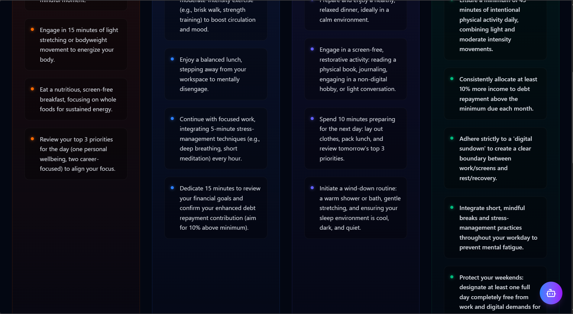 - 10+ Metrics Analyzed: Evaluates sleep, stress, debt, diet, and more.