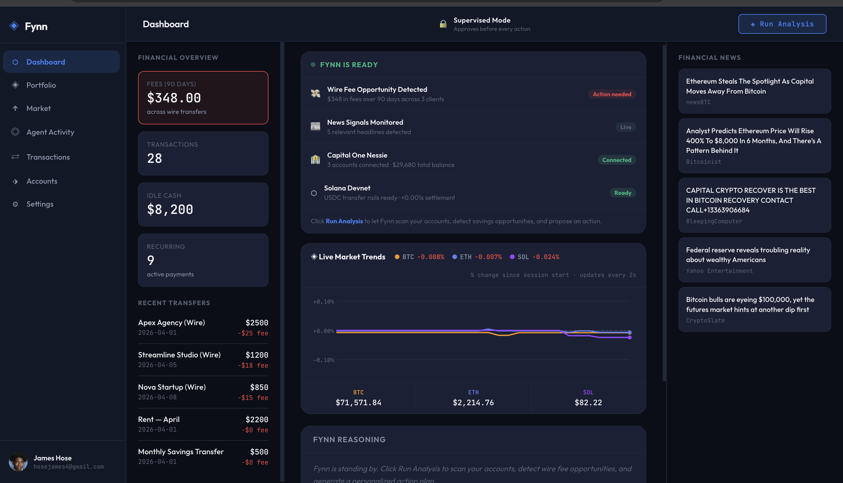 We are most proud of the end-to-end intelligence loop. Fynn reads banking data, reasons about it using a live language model, cross-references live news and crypto prices, and proposes a specific action with exact dollar amounts and client names. The reasoning panel streams live so judges can watch the agent think. We are also proud of the trust mode system. The distinction between Autonomous and Supervised Mode is not cosmetic --- it genuinely changes how the agent behaves and who has final say over financial decisions. Building an agent that has the ability to trade coin over intervals without a human in the loop is a feature we are incredibly bullish on.