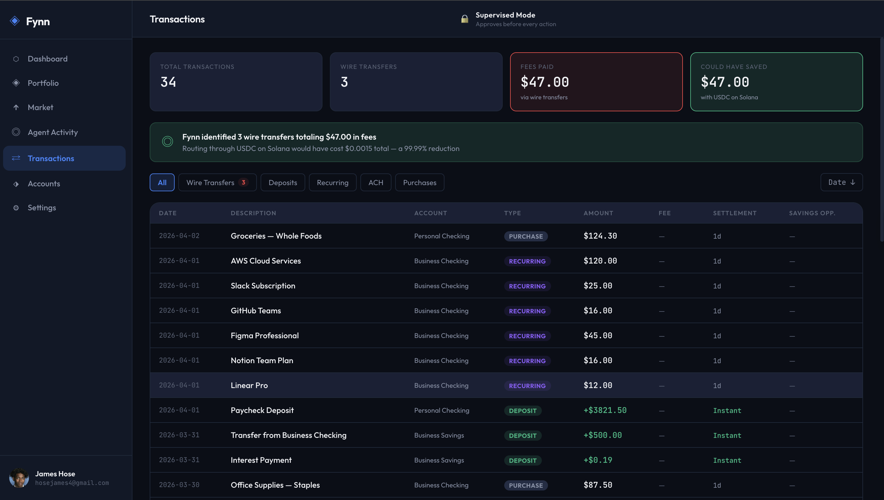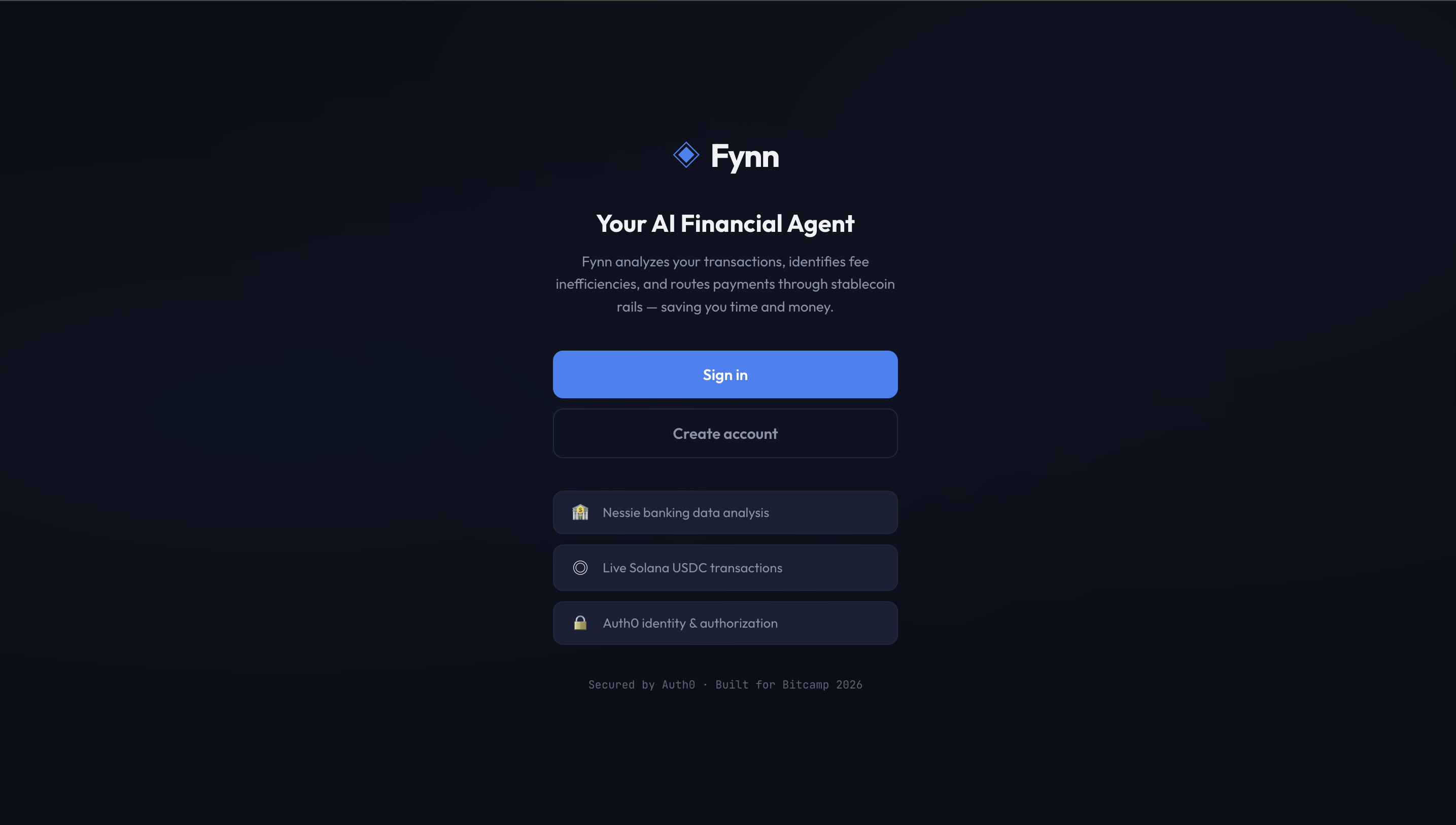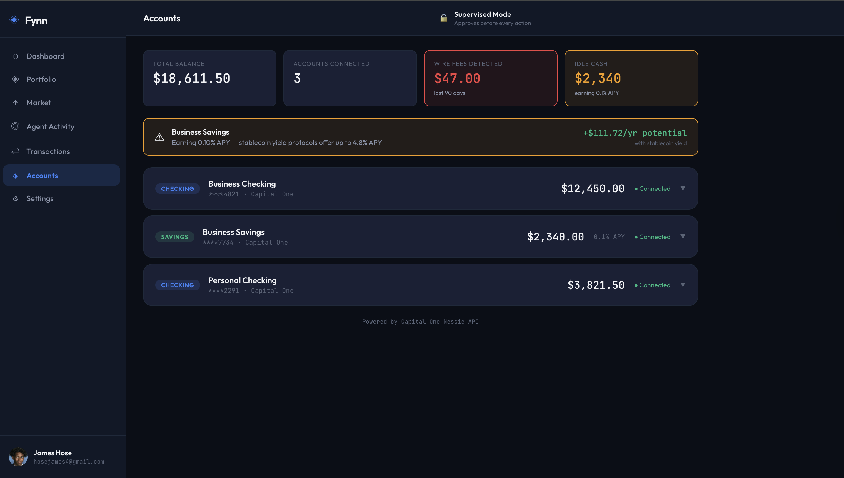 Fynn is an AI-powered financial agent built for freelancers and small businesses. It connects to your Capital One accounts via the Nessie API, scans your transaction history, and detects wire transfer patterns that are costing you money. It then proposes switching those payments to USDC on Solana --- a stablecoin transfer that costs fractions of a cent and settles in under 10 seconds instead of 3 business days.