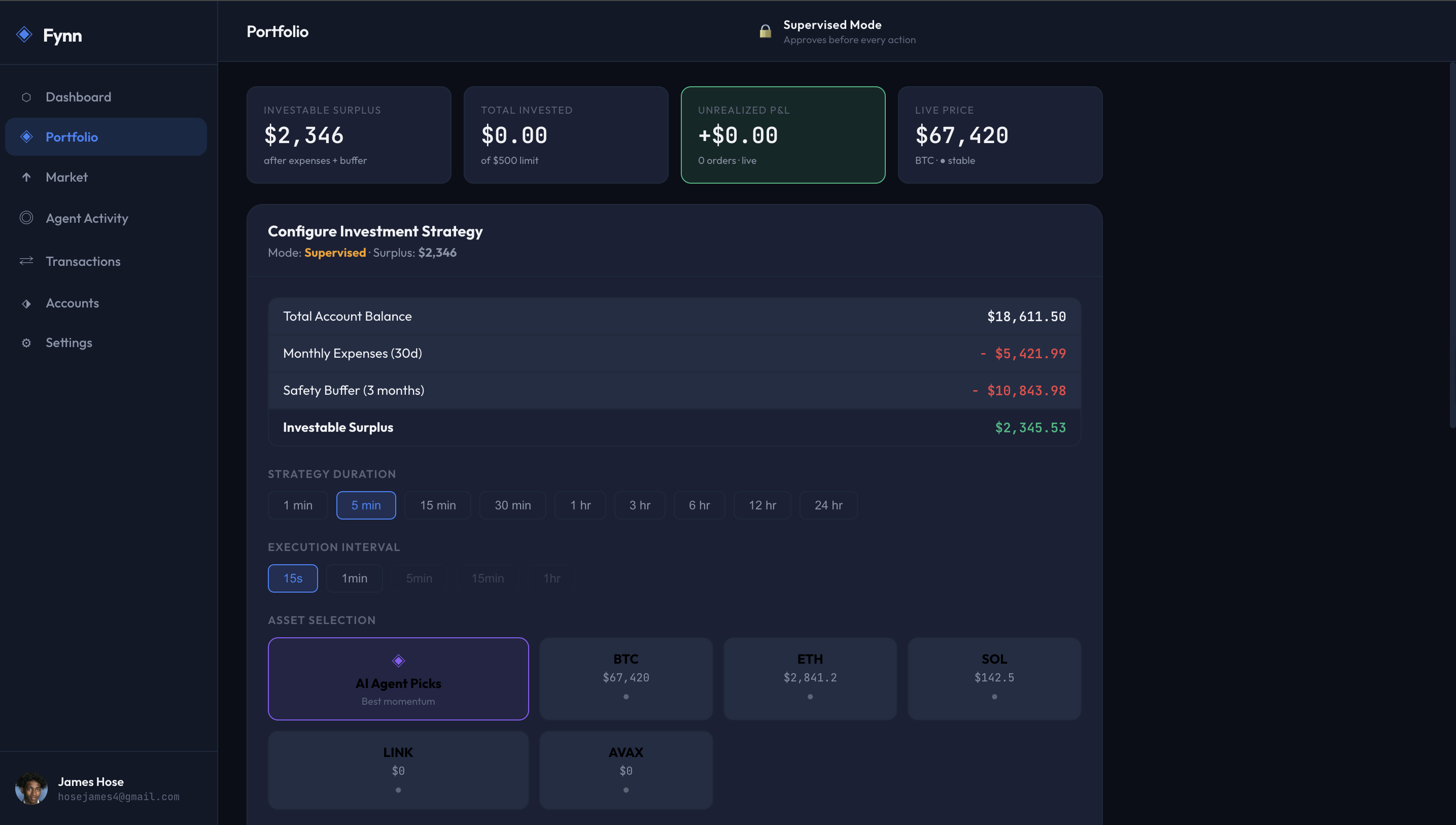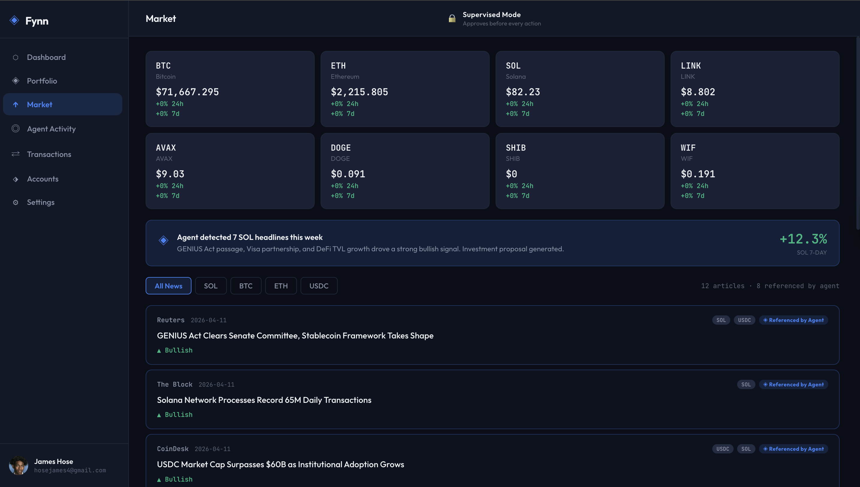 Beyond payment optimization, Fynn includes a live market intelligence layer that monitors financial news in real time. When it detects a strong buy signal for a cryptocurrency based on current headlines, it proposes a medium-risk investment using your calculated investable surplus. In Supervised Mode, Fynn sends an approval request to a second device before executing any action. In Autonomous Mode, it acts immediately without interruption.