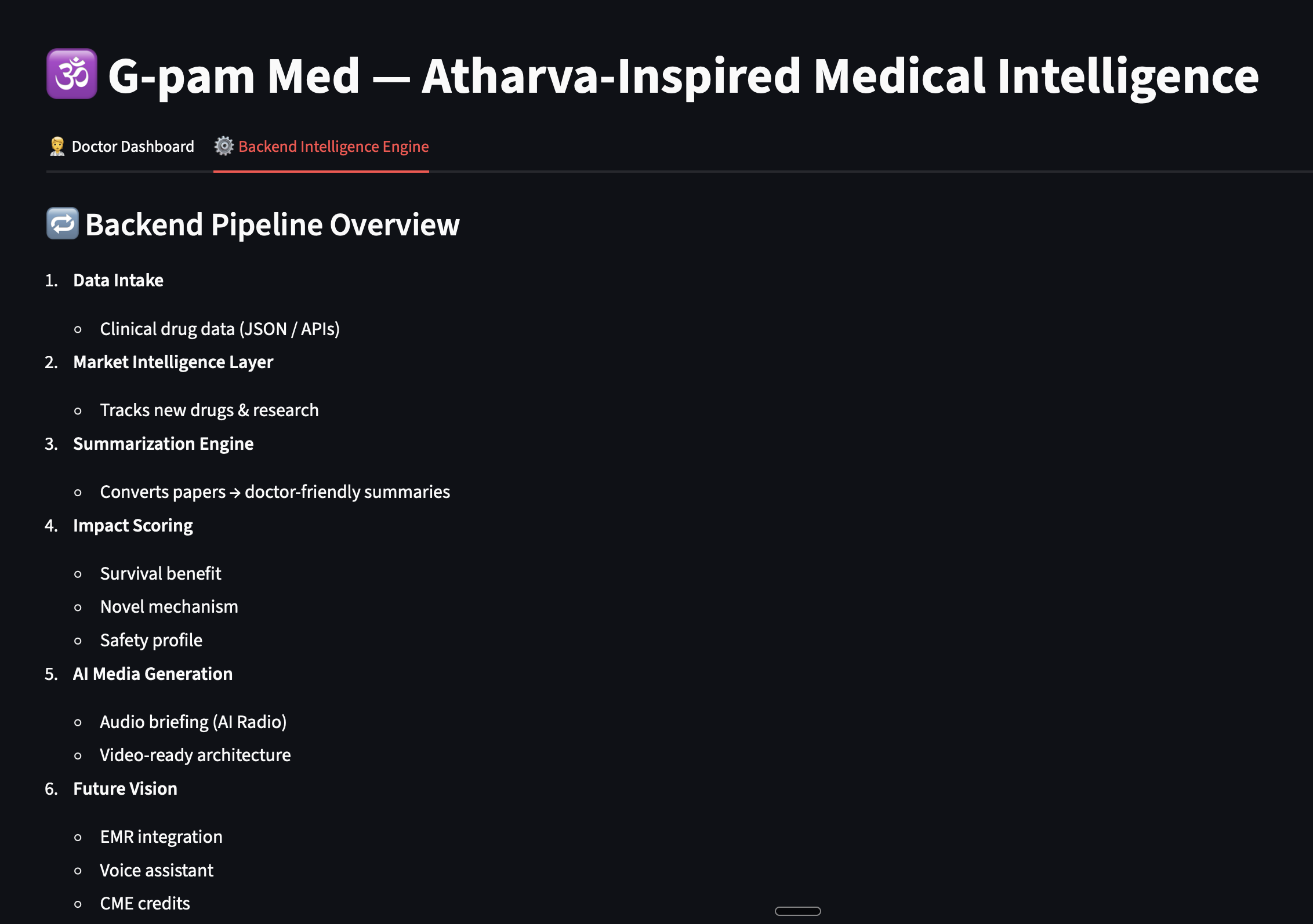 Next up for G-pam Med: moving past the prototype stage and turning into a real, clinically integrated intelligence platform. We’re jumping right into collecting info straight from regulators, clinical trial databases, and new research—basically, making sure our insights never get stale. One of our big goals is to boost the Clinical Impact Score. We do that by digging into long-term outcomes data and sticking to the latest guidelines. We’re also making things way more personal. Doctors will get updates tailored to their specialty, their patients, and the treatment protocols they actually use. By connecting with hospital EMR systems and setting up secure authentication, we’re making it simple to fit G-pam Med into daily routines. Plus, we’re working on a voice-activated assistant, so doctors can get hands-free updates during breaks or while driving between clinics. We’re rolling out some accessibility upgrades too—think medical summaries in more languages (starting with Hindi), and tracking for CME-compliant content. At the end of the day, we want G-pam Med to be a tool doctors can always count on. It keeps them informed, confident, and focused on what matters: patient care.