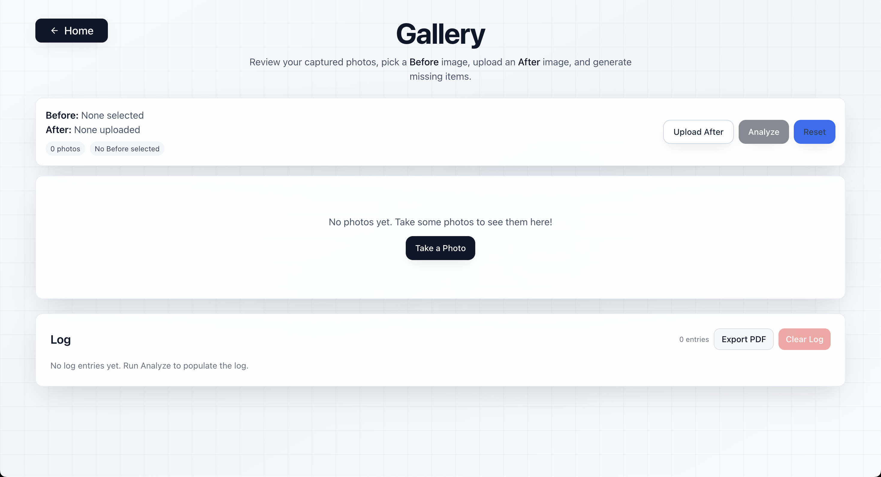 Our app allows users to insert before and after images of incidents, which the app compares through object recognition to document missing items, which are stored in a database, and Google Gemini to estimate the prices of those items. It then creates a list of missing items along with their price estimates and total cost in damages, and allows users to print the list in a PDF format to send to insurance companies.