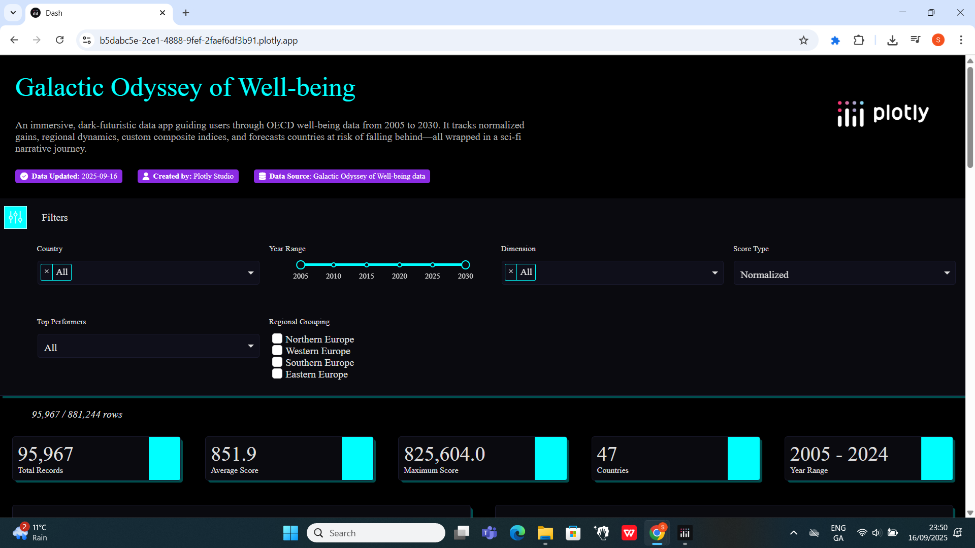I’ve always been fascinated by science fiction’s power to reframe our perspective, turning data into an epic journey. When I discovered the richness of OECD well-being metrics—from health to life satisfaction—I imagined guiding users on a “Galactic Odyssey” through those numbers. Framing these global statistics as interstellar waypoints felt like the perfect way to spark curiosity and make trends feel alive.