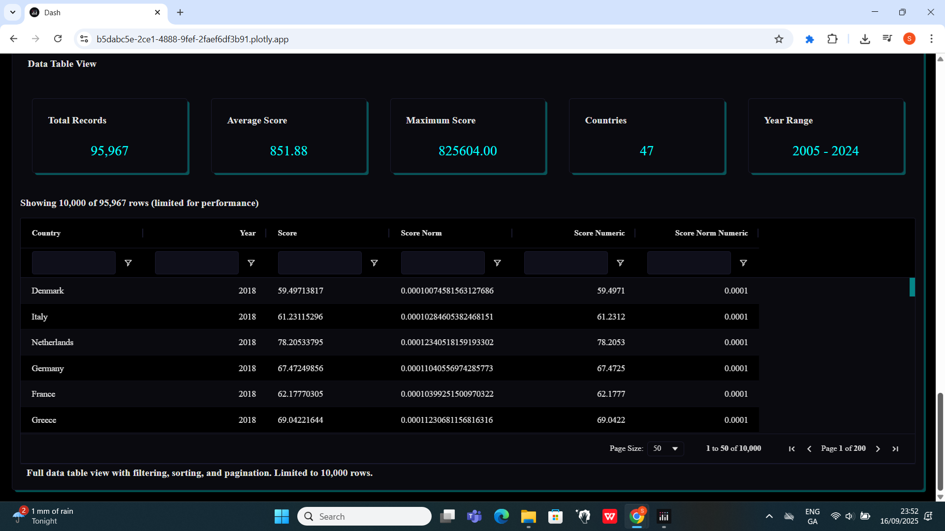 - Data Table View: I drill into all 95,967 records with sorting, filtering, pagination, and summary stats cards.