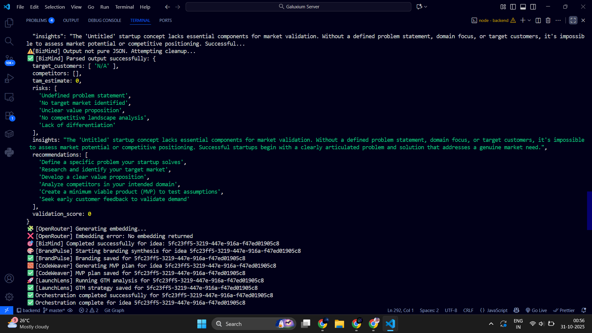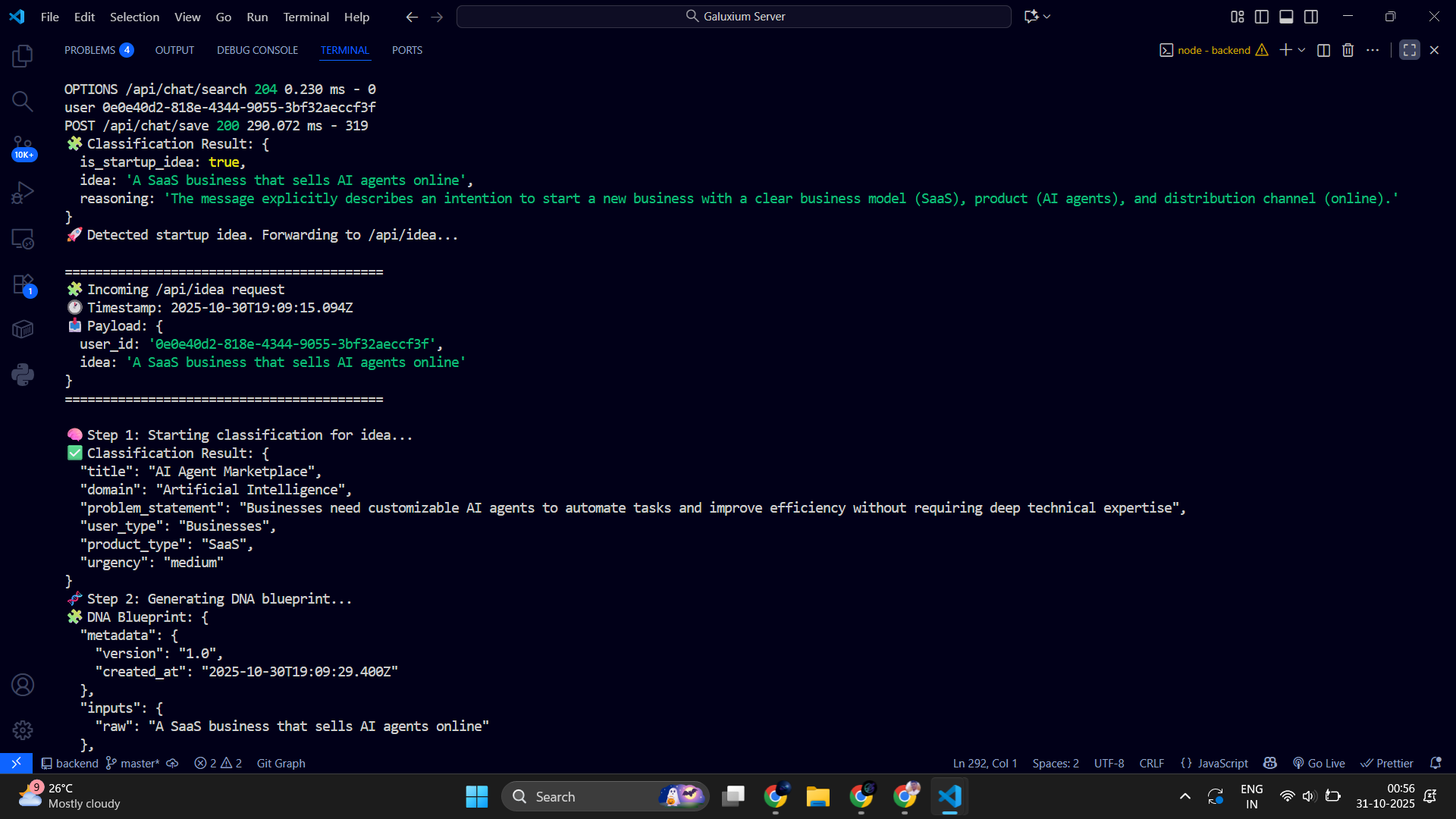Unlike static generators, Galuxium uses Server-Sent Events (SSE) to stream each step’s progress live from the backend. Users can watch every action unfold — idea validation, brand design, logo creation, MVP build — all in real-time.