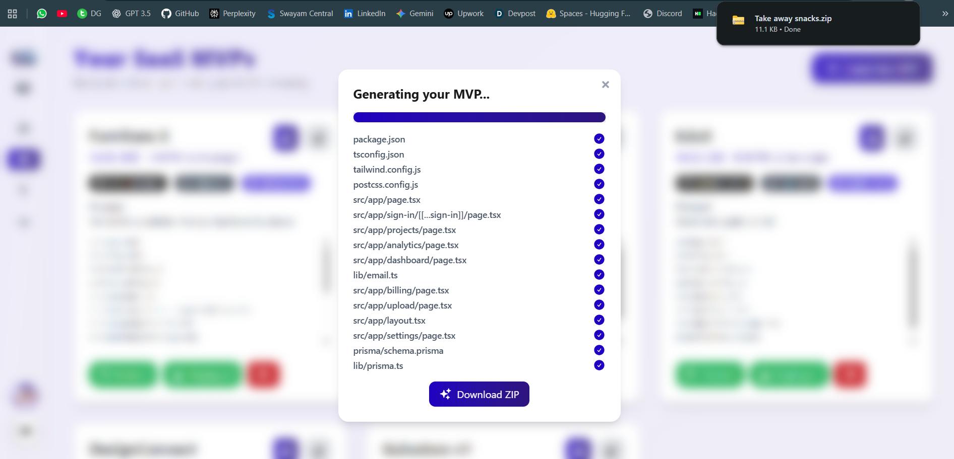 - Generates a complete code scaffold (Next.js + Supabase + Tailwind).