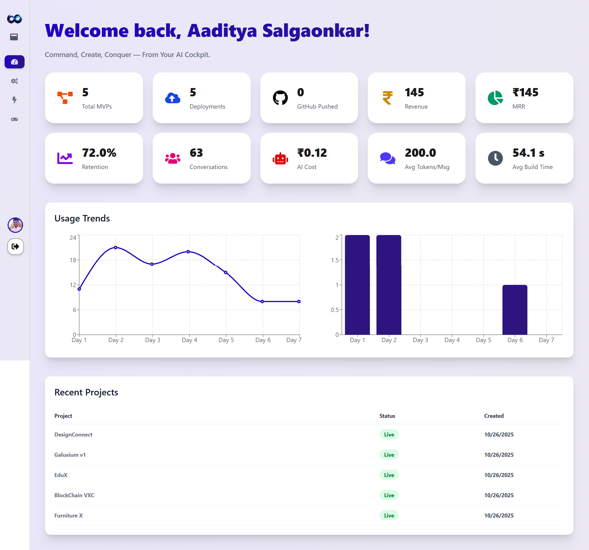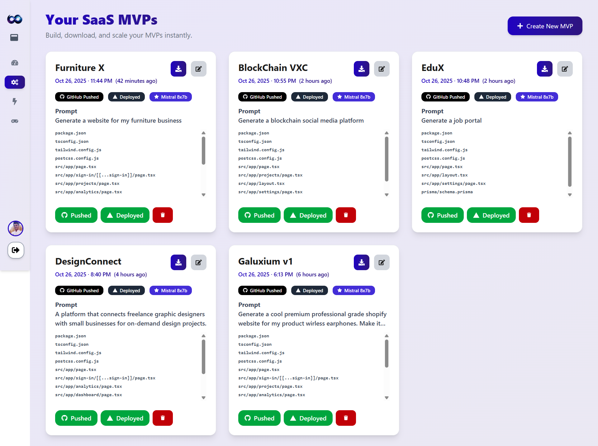 - Idea → MVP: Convert natural language idea prompts into a full project scaffold (frontend + backend) with routes, pages, authentication, and seed data.