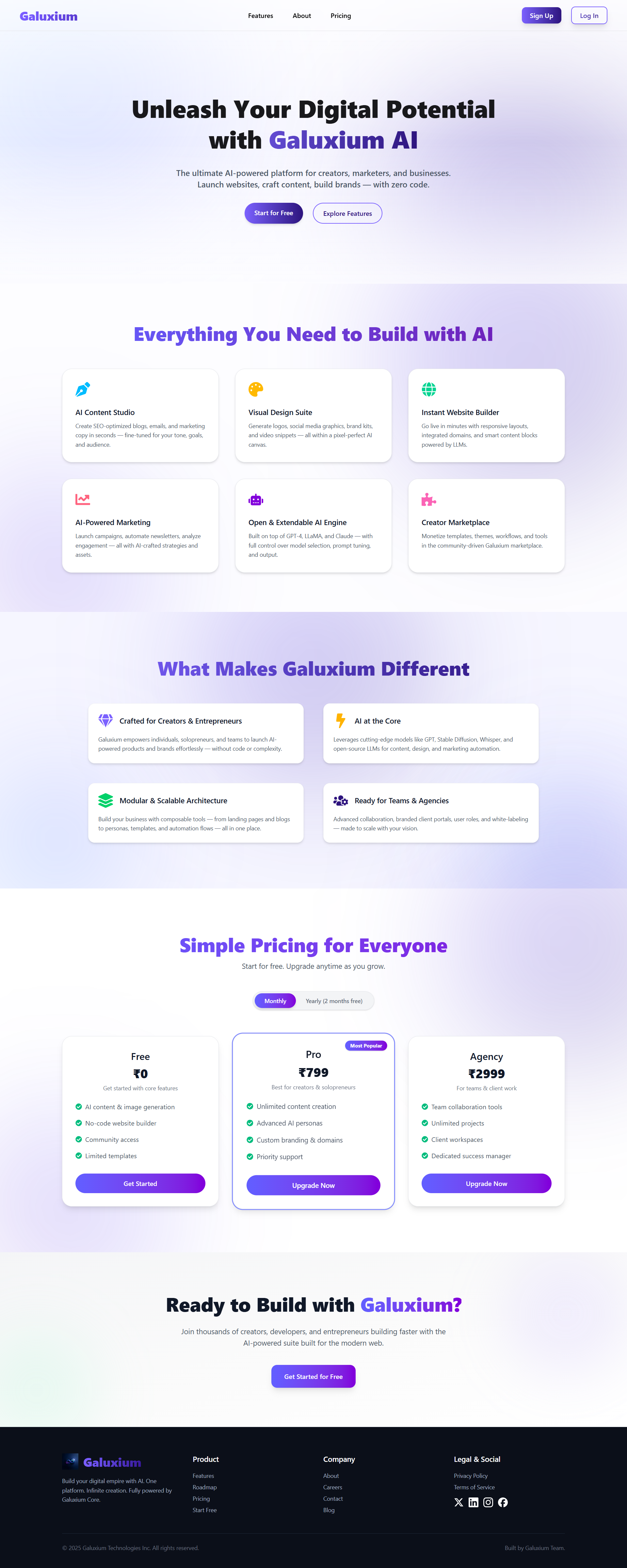 Galuxium accepts high-level product prompts and produces a fully structured, runnable web application tailored to the user’s chosen use case.