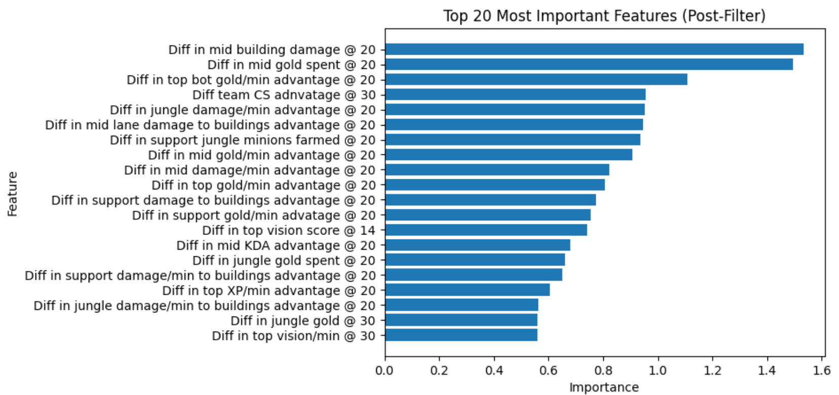 The primary challenge in the main project was properly understanding which features to use for modeling. League of Legends match outcomes are highly noisy, especially when considering the fact that the predictions we use do not use any in-game information, such as graphs and current game state. Hence, there were bottlenecks in improving model performance beyond ~65%. For similar reasons, when explaining which features drive win probability, it was difficult to disentangle statistics that represented the consequences of victory (e.g. gold share at game end) versus statistics that represented causes of victory (e.g., mid push advantage @ 20).