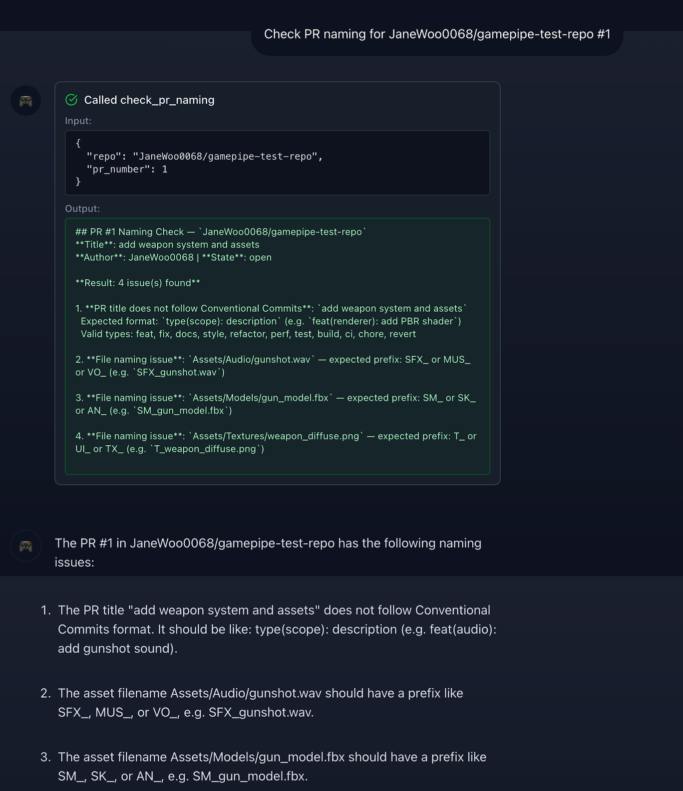 check_pr_naming) — Validates that pull request titles follow the Conventional Commits format (feat(renderer): add PBR shader) and checks that changed files follow UE-style naming conventions (e.g.T_Character_Diffuse.png,SM_Rock_Large.fbx).Asset Naming Validation (
