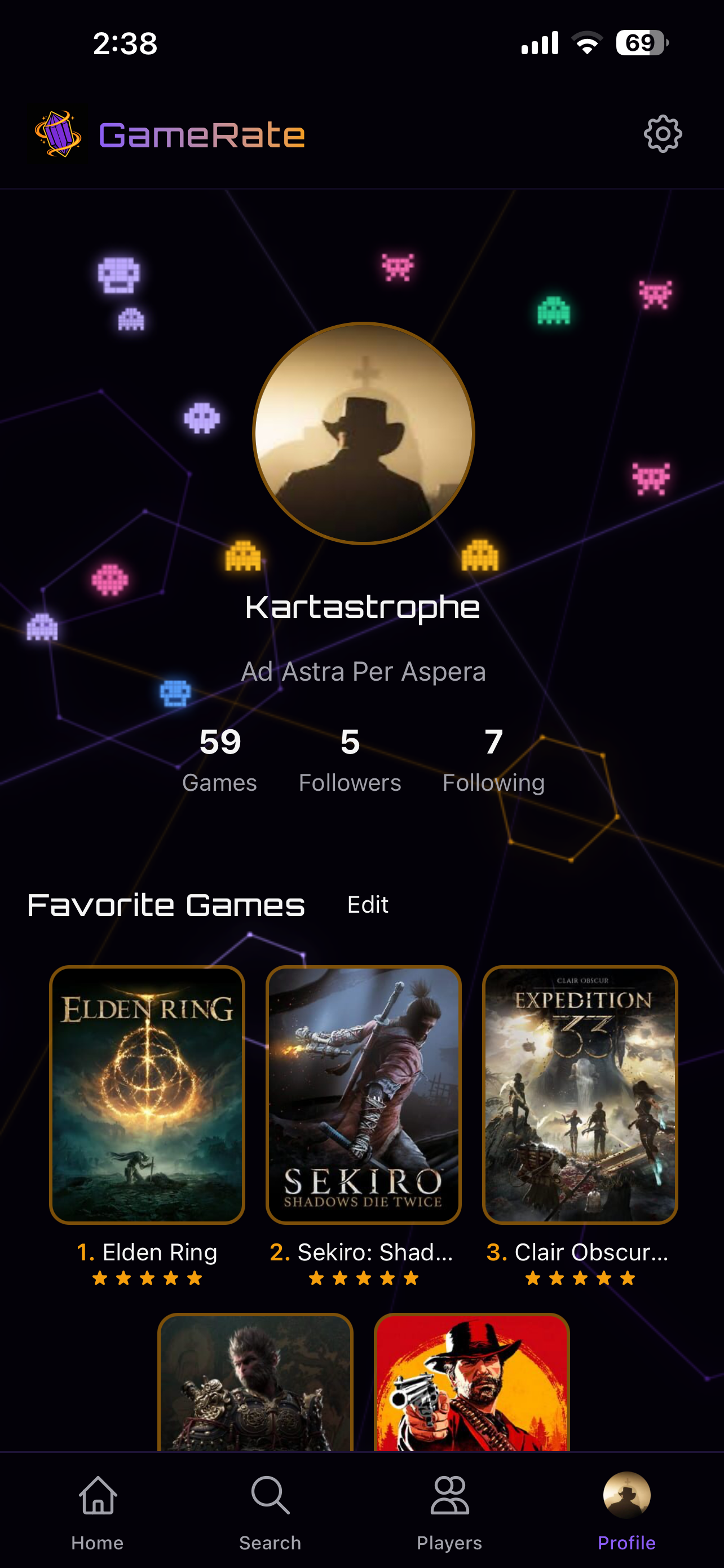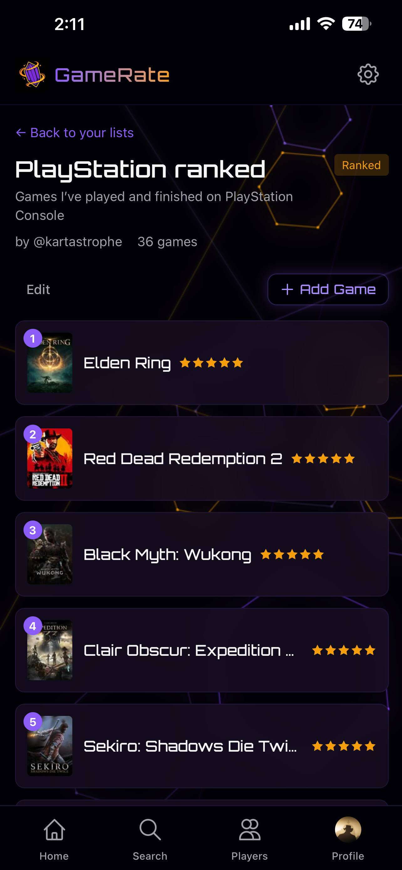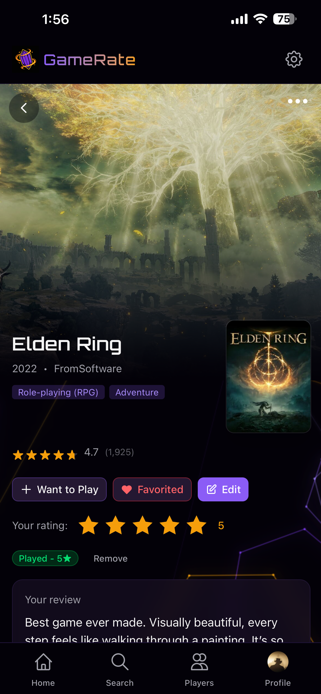 GameRate is a mobile-first PWA. Add it to your home screen, and it feels like a native app, no app store needed. You can rate games with half-stars because sometimes a game is more than a 4 but not quite a 5. You can pin your all-time Top 5 favorites to your profile, create personal lists like "Best RPGs of All Time" or "Hidden Gems", follow friends to see what they're playing and rating, write reviews, and track your full gaming journey across played, playing, want to play, and dropped.