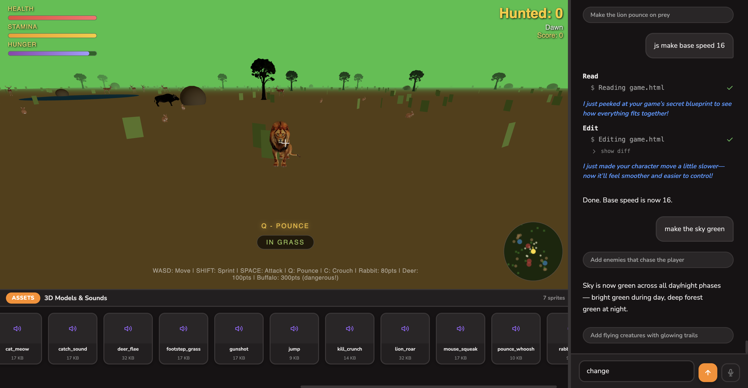 Asset library and sharing. A persistent gallery of community-generated 3D sprites and sound effects so users don't have to regenerate common assets (trees, coins, explosions) from scratch every time.