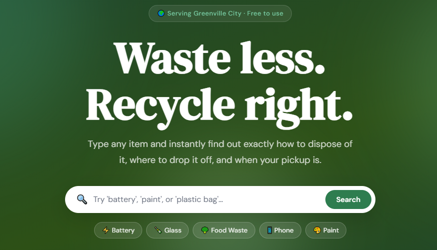 A production-ready MVP that helps residents dispose of any item correctly based on local waste rules. Built with pure HTML, CSS, and Vanilla JavaScript β no frameworks, no backend.