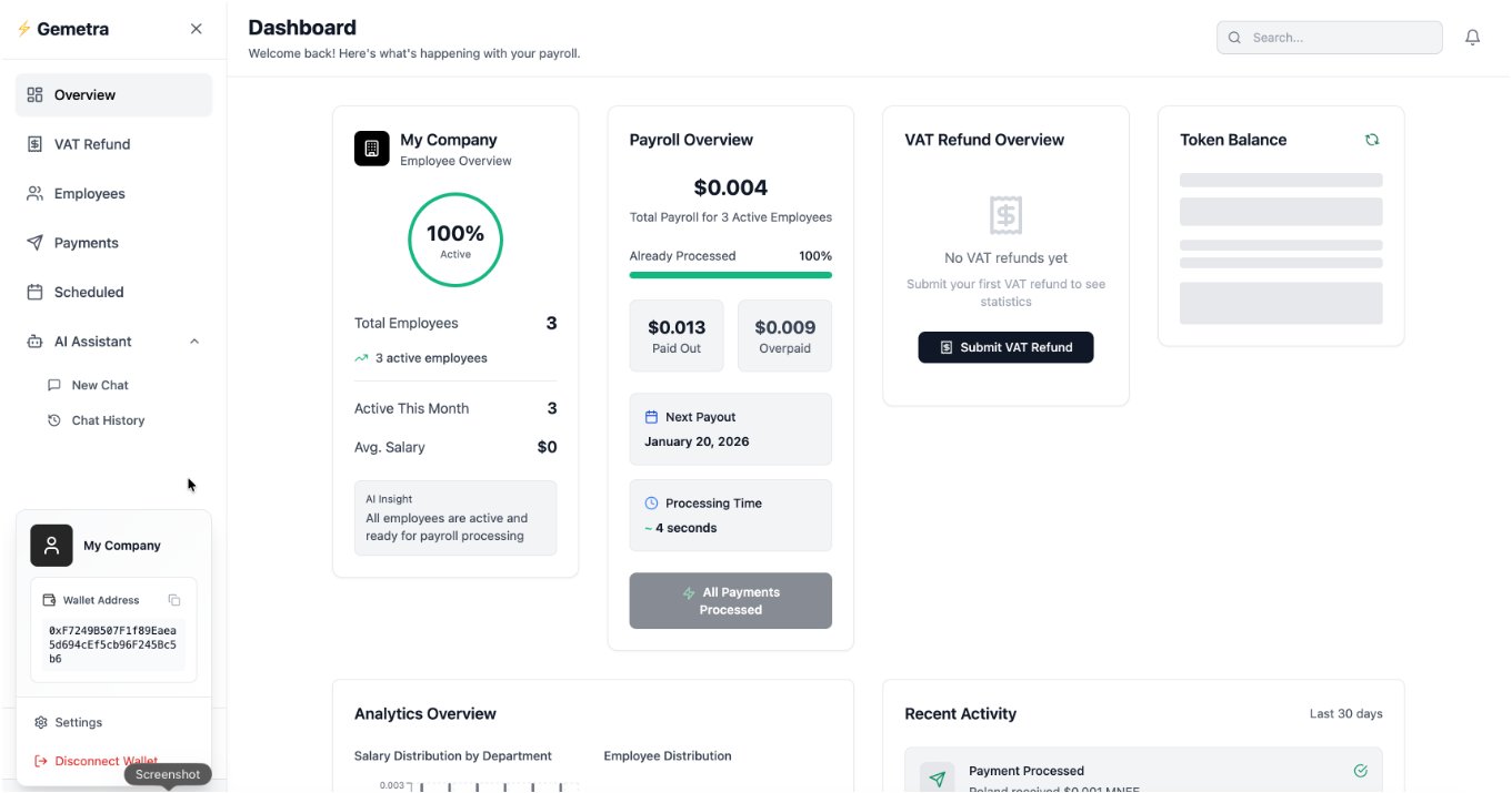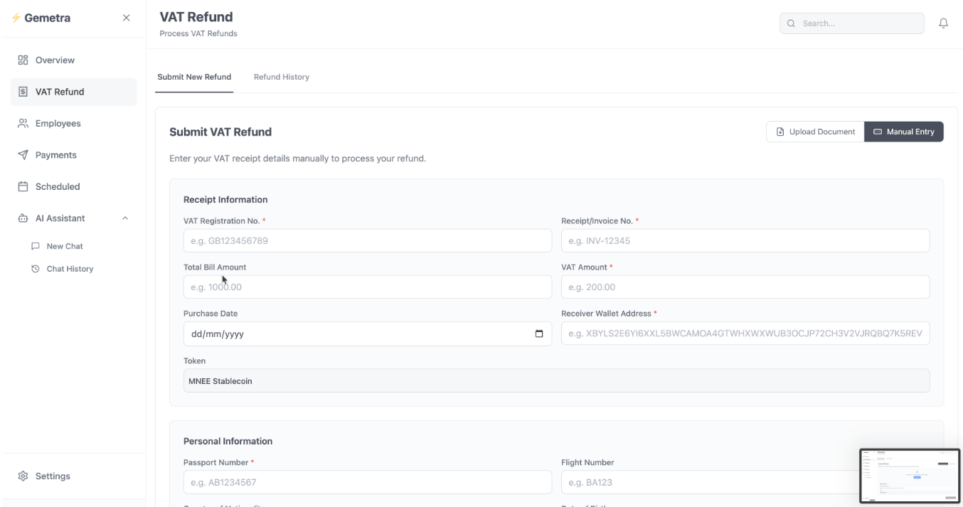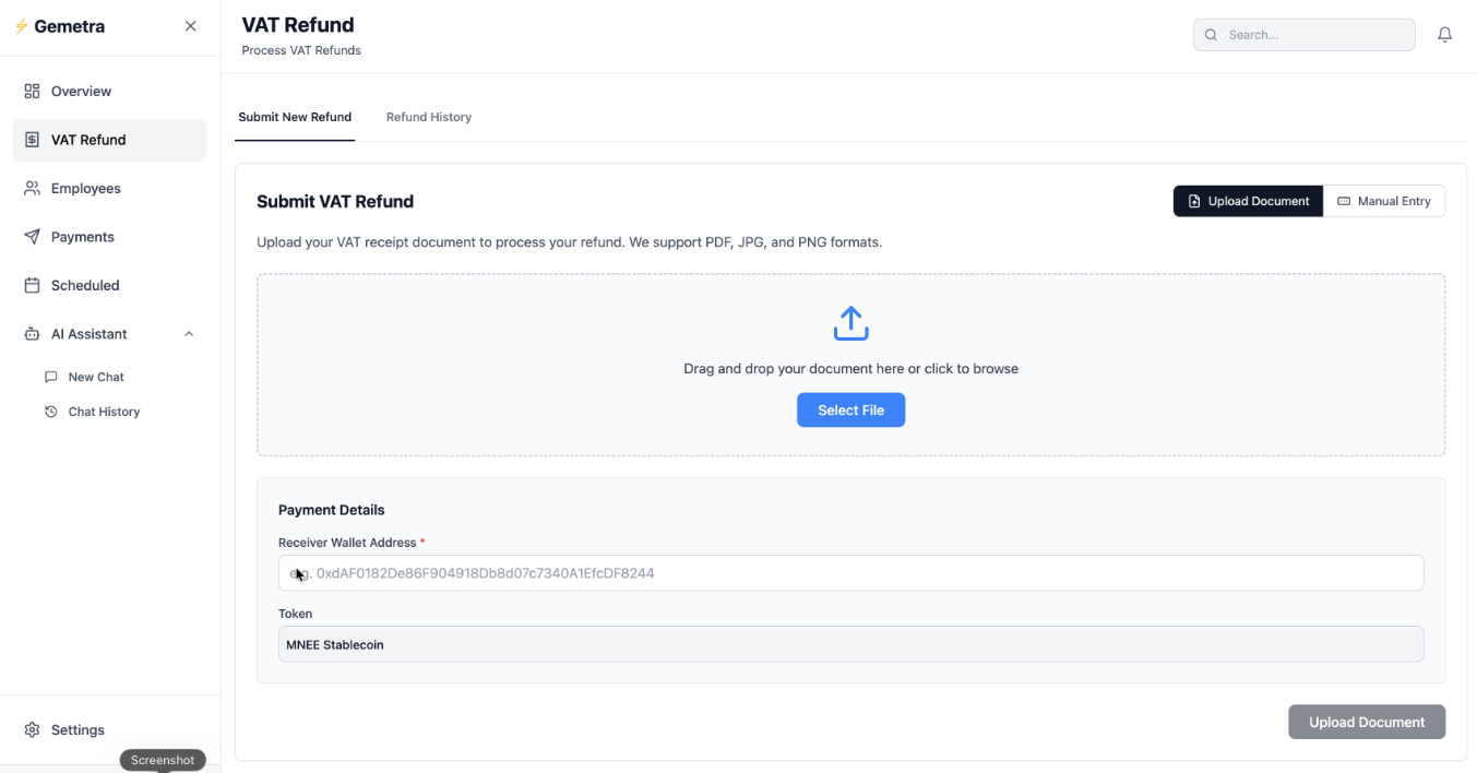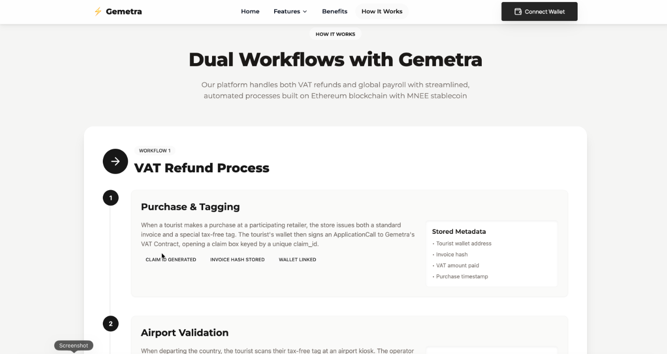 Tourists can upload receipts digitally, and our system uses AI to validate eligibility and calculate refunds. Once approved, payments are instantly sent in MNEE stablecoins directly to their wallets. This eliminates paperwork, queues, and delays while ensuring complete transparency through blockchain records.