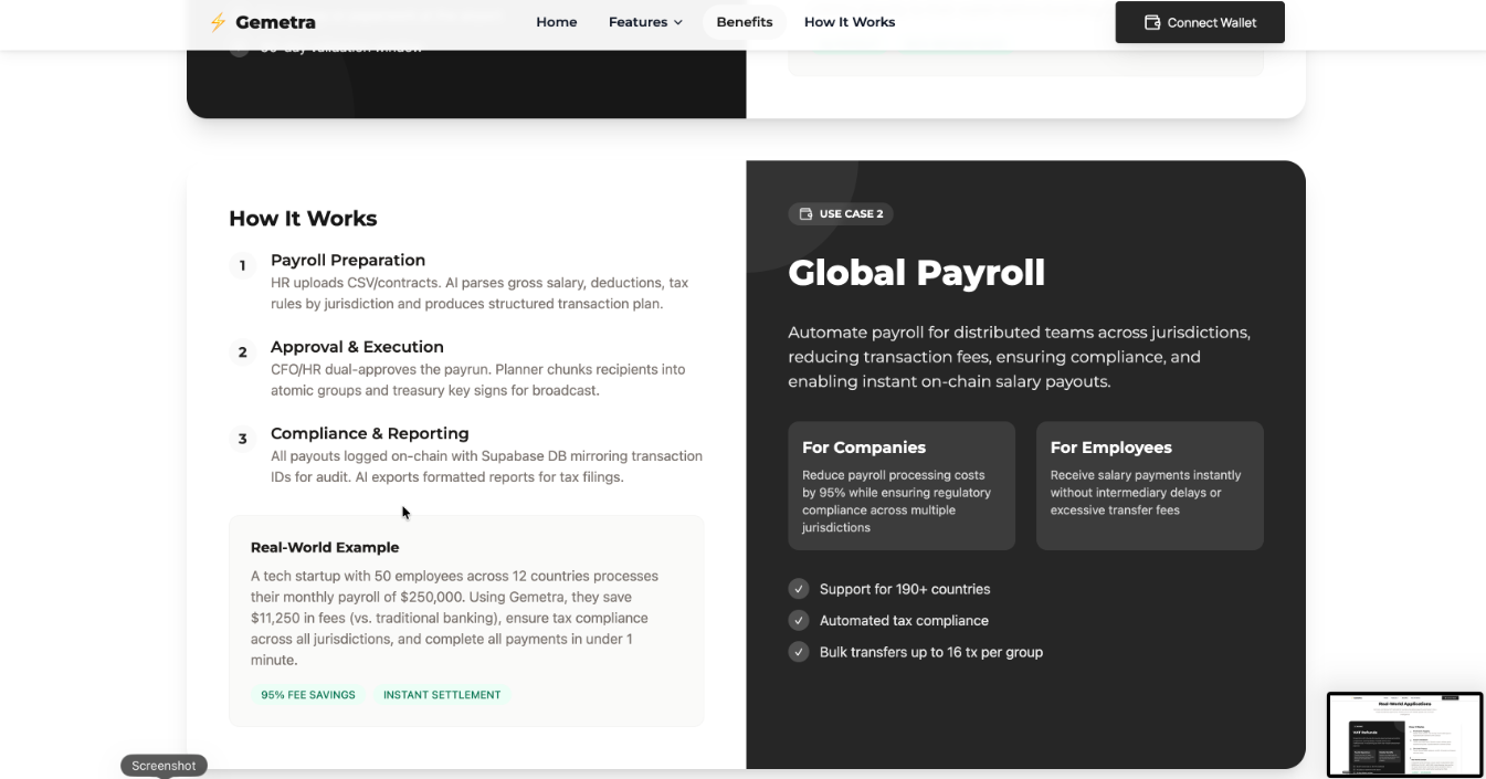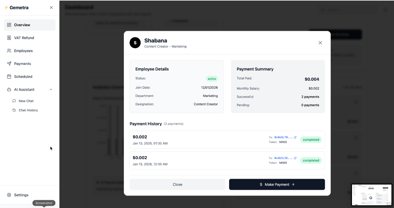 Companies can upload employee payroll data via CSV or APIs. The system automatically calculates salaries, taxes, and deductions, then processes instant global payments using blockchain. Every transaction is verifiable, ensuring trust and compliance.