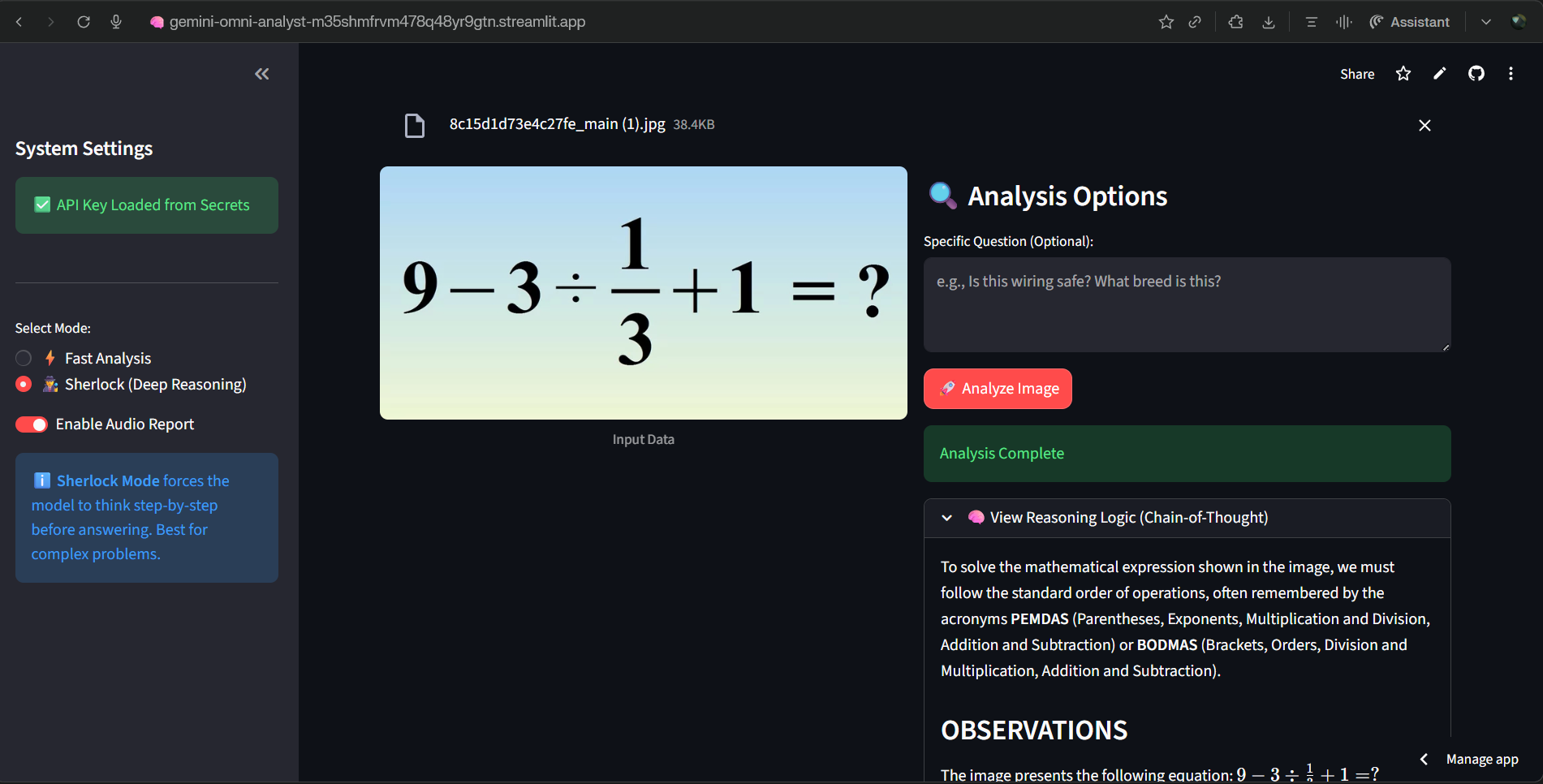 Gemini Omni-Analyst is a multimodel intelligence engine that processes images and video streams to provide deep insights. Sherlock Mode (Chain-of-Thought): Unlike standard chat bots, this mode forces the model to "think before it speaks." It breaks down complex images into observations, safety checks, and logical steps before generating a final answer, drastically reducing hallucinations. Video Stream Understanding:It goes beyond static pixels by analyzing video files to understand motion, temporal context, and evolving events. Hands-Free Accessibility:The app automatically generates audio reports using text-to-speech, making complex data accessible to users in hands-busy environments.