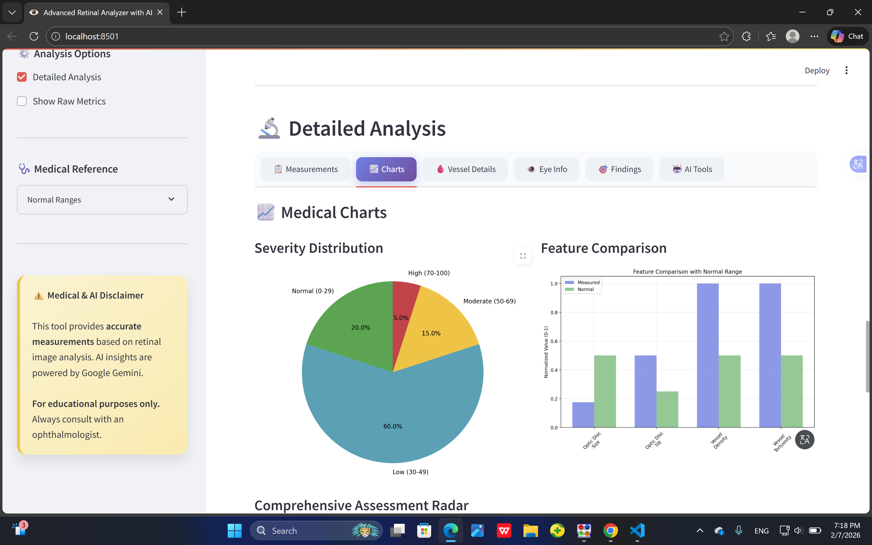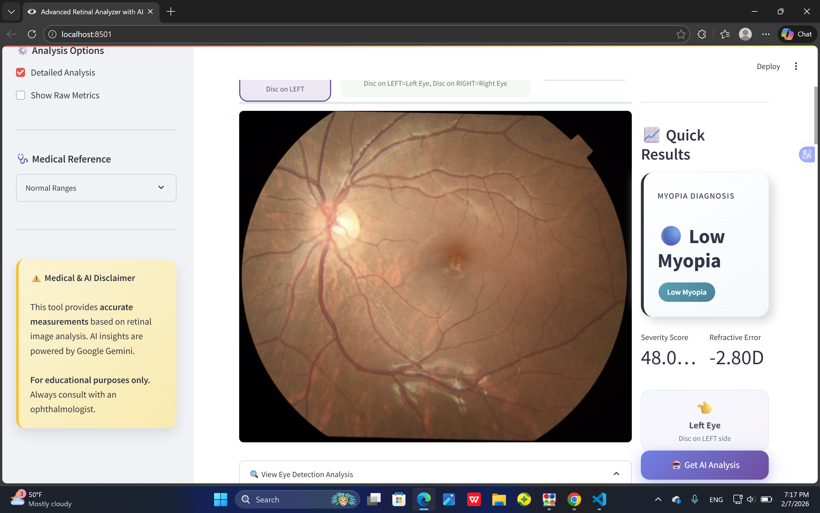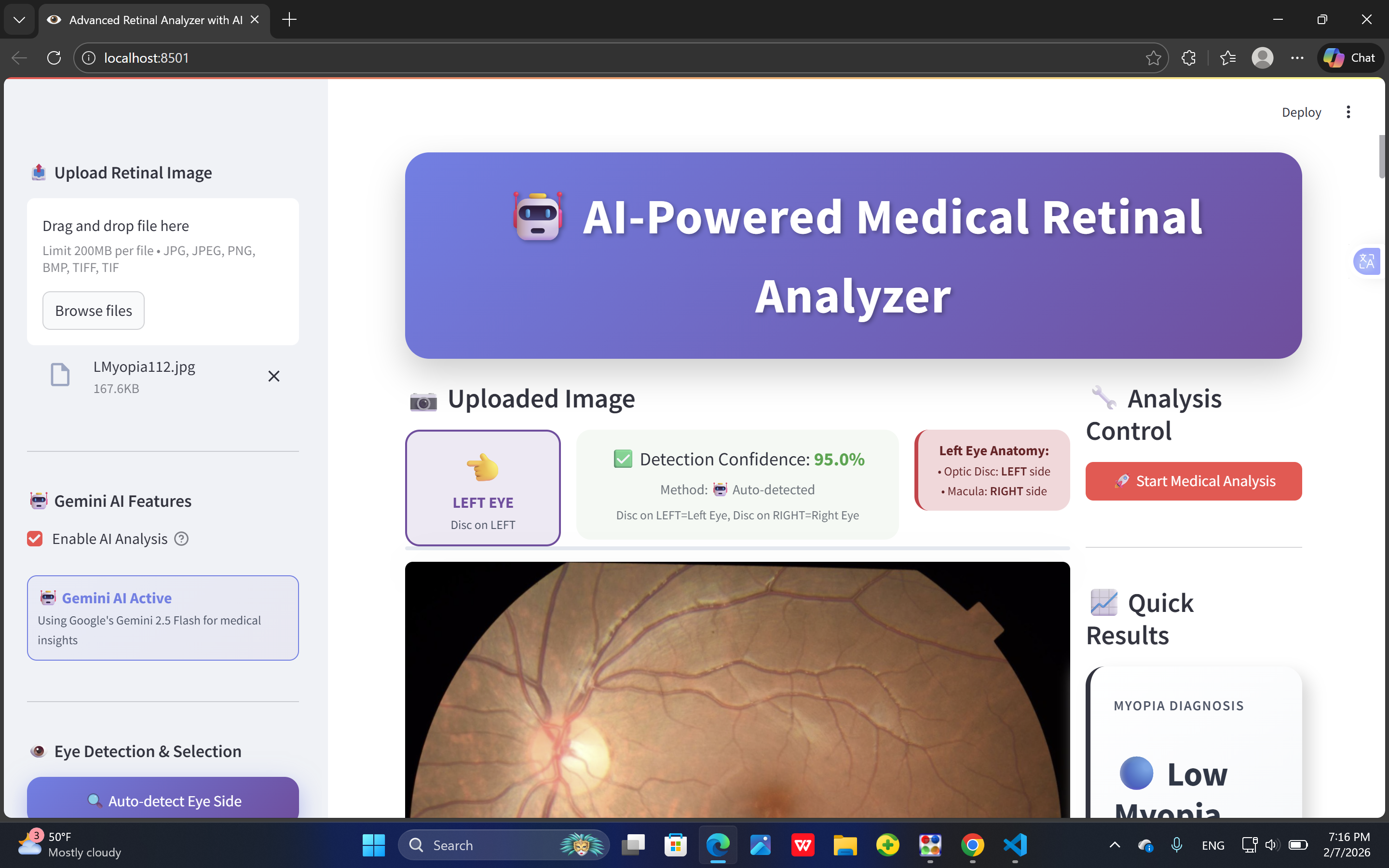 Our system analyzes ophthalmoscopic retinal photographs to detect and assess the severity of myopia. By leveraging the Gemini 2.5 multimodal API, it interprets both visual and textual data to provide a screening report indicating possible myopia indicators and their severity level. The tool is designed for educational and research use, helping doctors, students, and developers explore how AI can support ophthalmology.