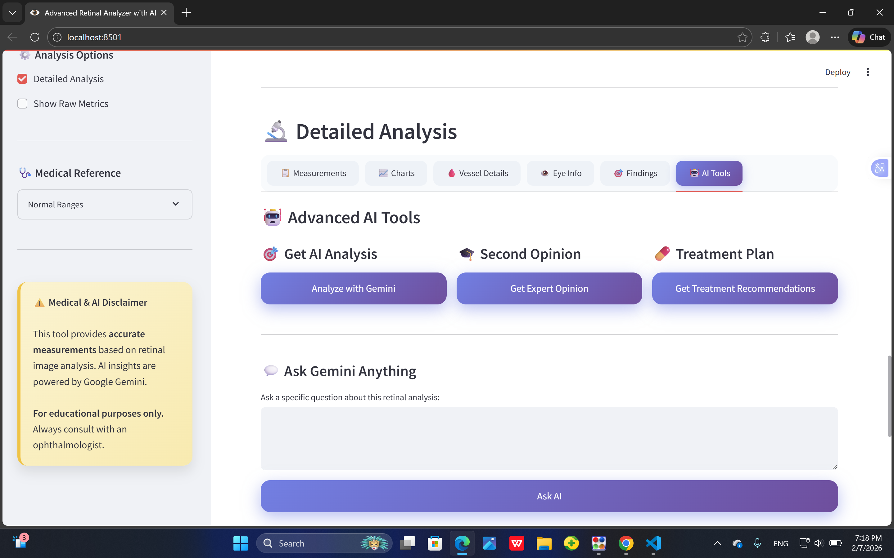 Our next goal is to expand the dataset and train a hybrid model combining Gemini’s reasoning with a custom CNN-based classifier for improved accuracy. We plan to collaborate with ophthalmologists to collect validated images, integrate OCT data, and potentially deploy the system as a cloud-based screening support tool for research and clinical education.