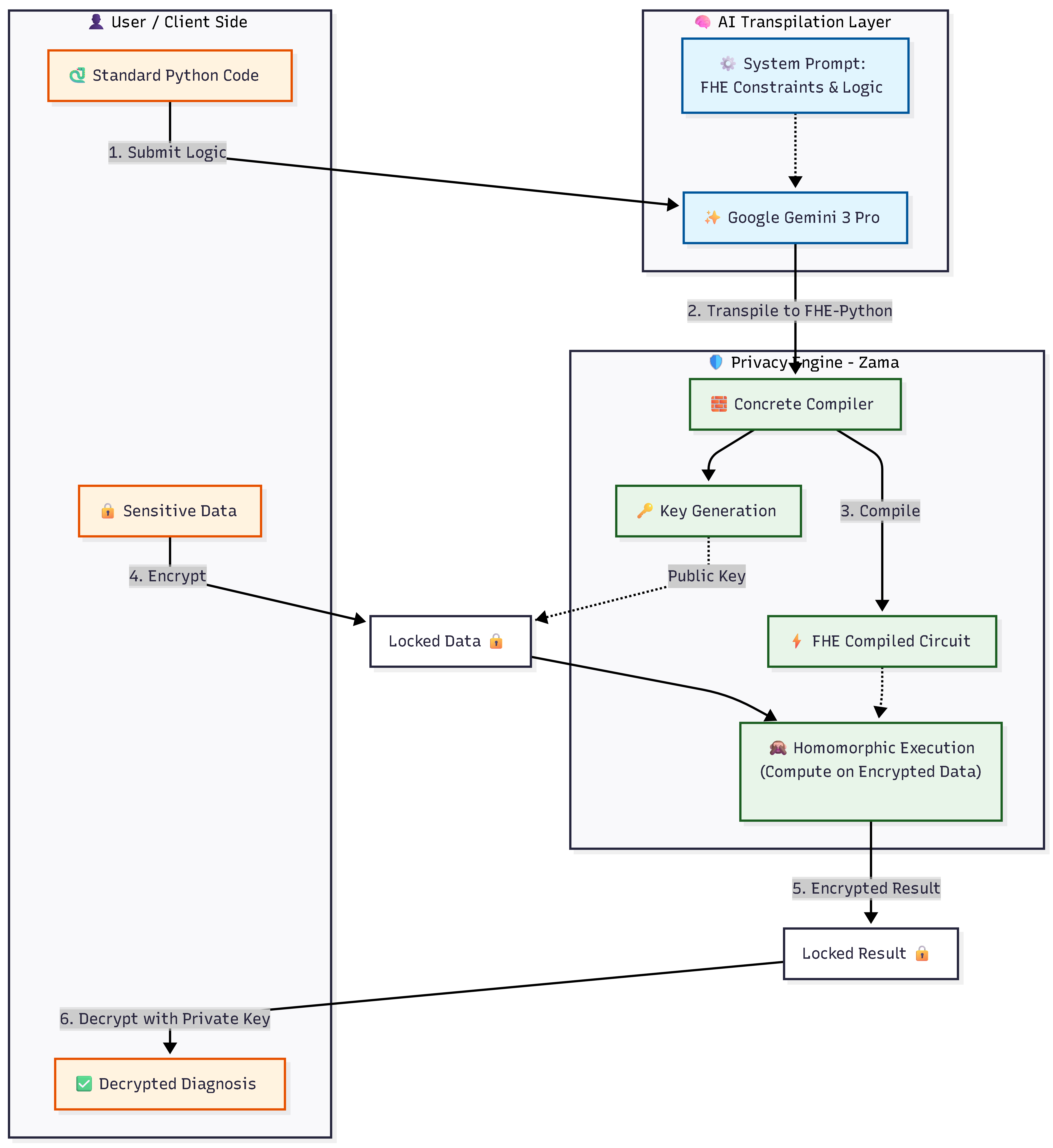 Concretelibrary (e.g., "replaceif/elsewithlookup_tablesor arithmetic branching"). - The Engine (Crypto): Zama Concrete, an open-source FHE compiler for Python. It turns the Gemini-generated code into actual cryptographic circuits.