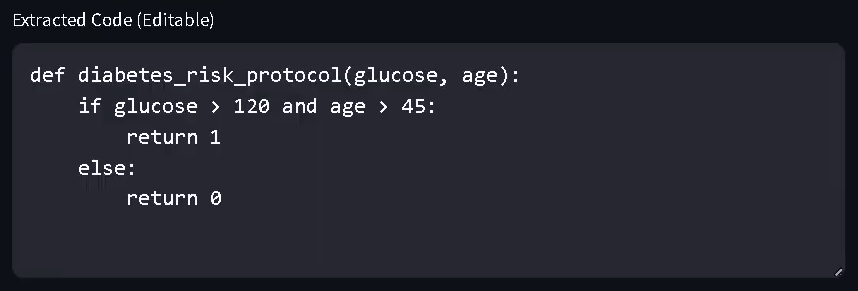 - Input: The user provides a standard Python function (e.g., a heart disease risk calculator) and defines the input types (e.g., Age, Blood Pressure).