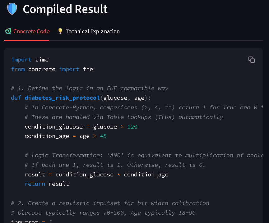 Concrete(Zama's FHE library) compatible code. It handles the strict constraints of FHE (no floating-point operations, bounded integers, bitwise logic). - Compilation & Execution: The generated code is compiled into an FHE circuit.