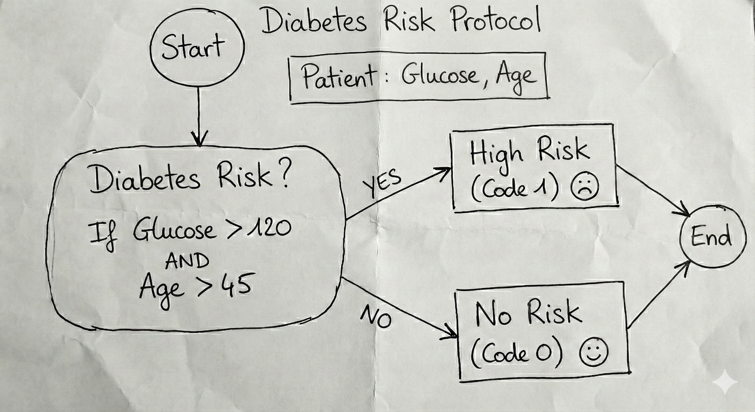 Input Logic: The "Diabetes Risk Protocol" flowchart used to demonstrate secure medical diagnosis.