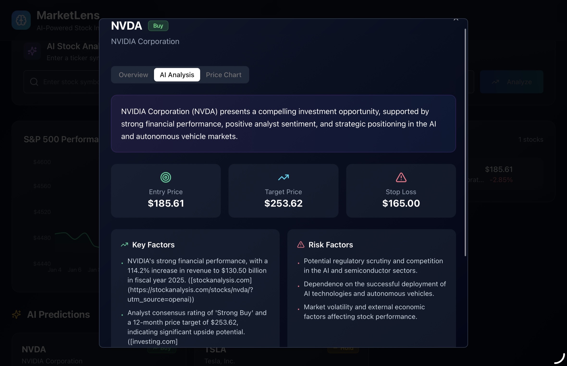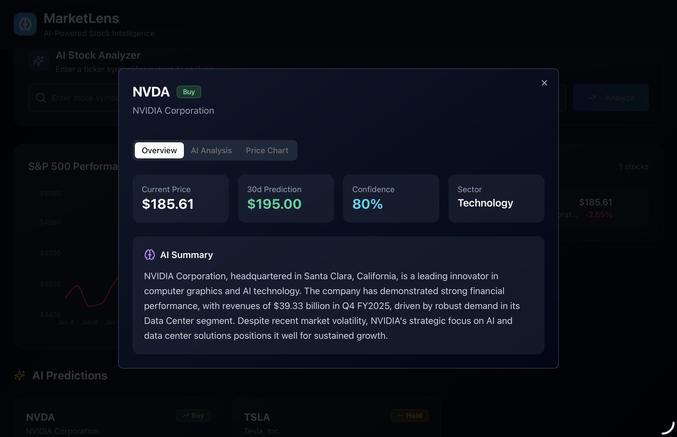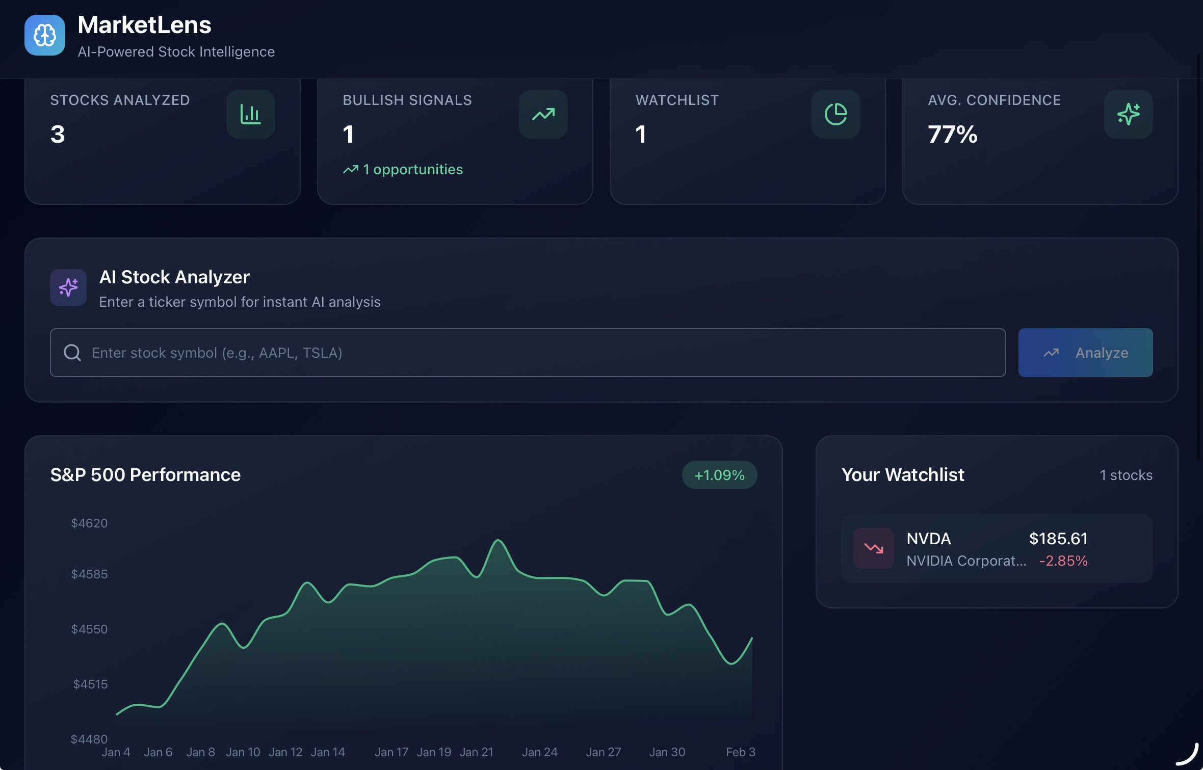 The inspiration for MarketLens came from observing how overwhelming and fragmented stock market information can be, especially for students and non-experts. While large amounts of public financial data exist, interpreting earnings reports, price movements, and market news together is challenging. This project was motivated by the idea that AI could help synthesise recent public data into clear, explainable insights about company performance, risk, and long-term viability, supporting more informed and responsible analysis.