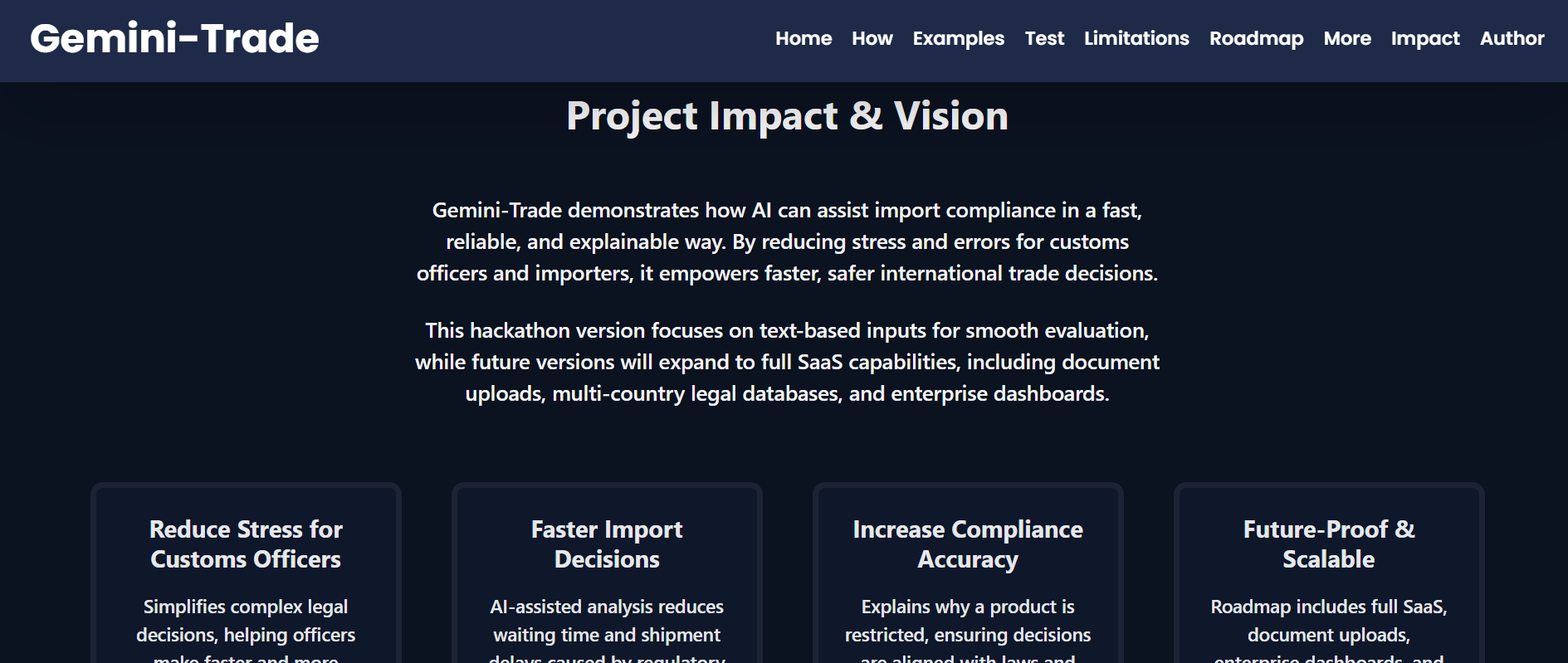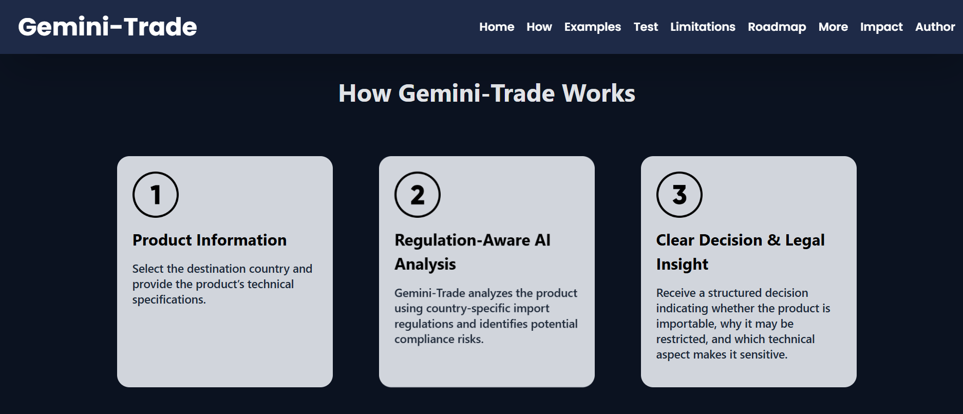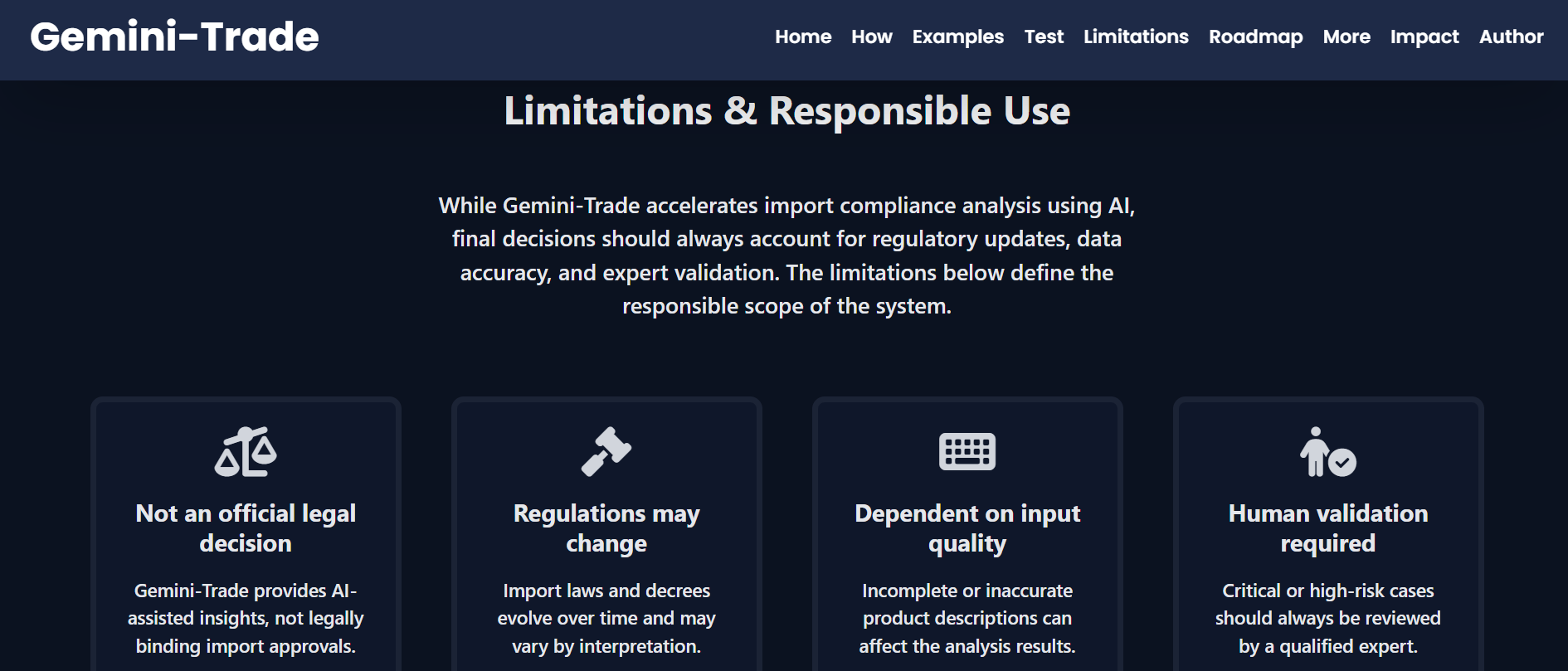 Another challenge was defining the scope of responsibility. Import regulations change frequently, so I had to clearly communicate that Gemini-Trade is a decision-support tool, not a legally binding authority.