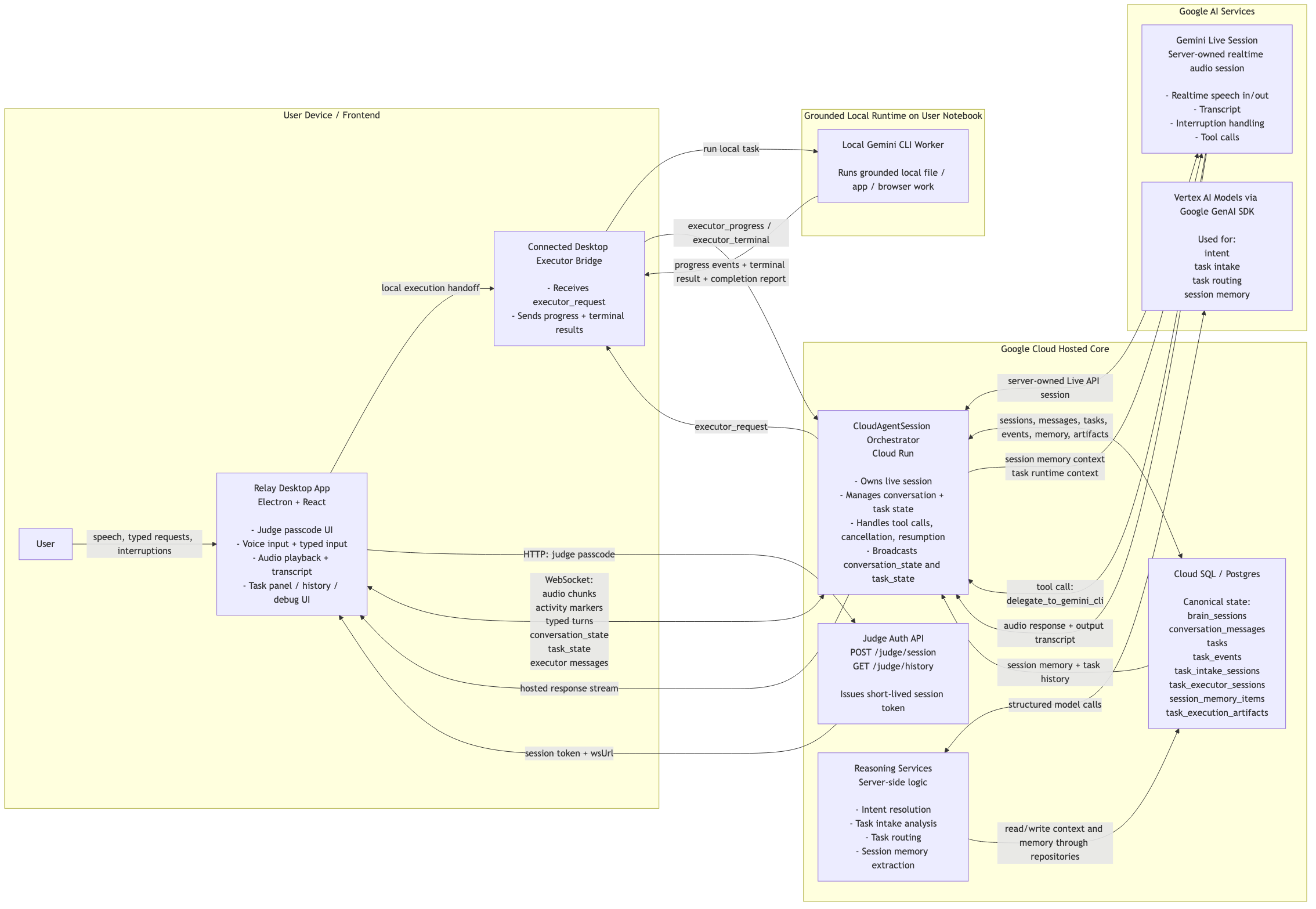 A user can start speaking naturally, ask Relay to perform a task, clarify details if needed, interrupt the assistant while it is talking, redirect the task, and continue the same conversation without losing state. Relay keeps the live session in the cloud, while local machine work is executed through a connected Gemini CLI runtime on the desktop.