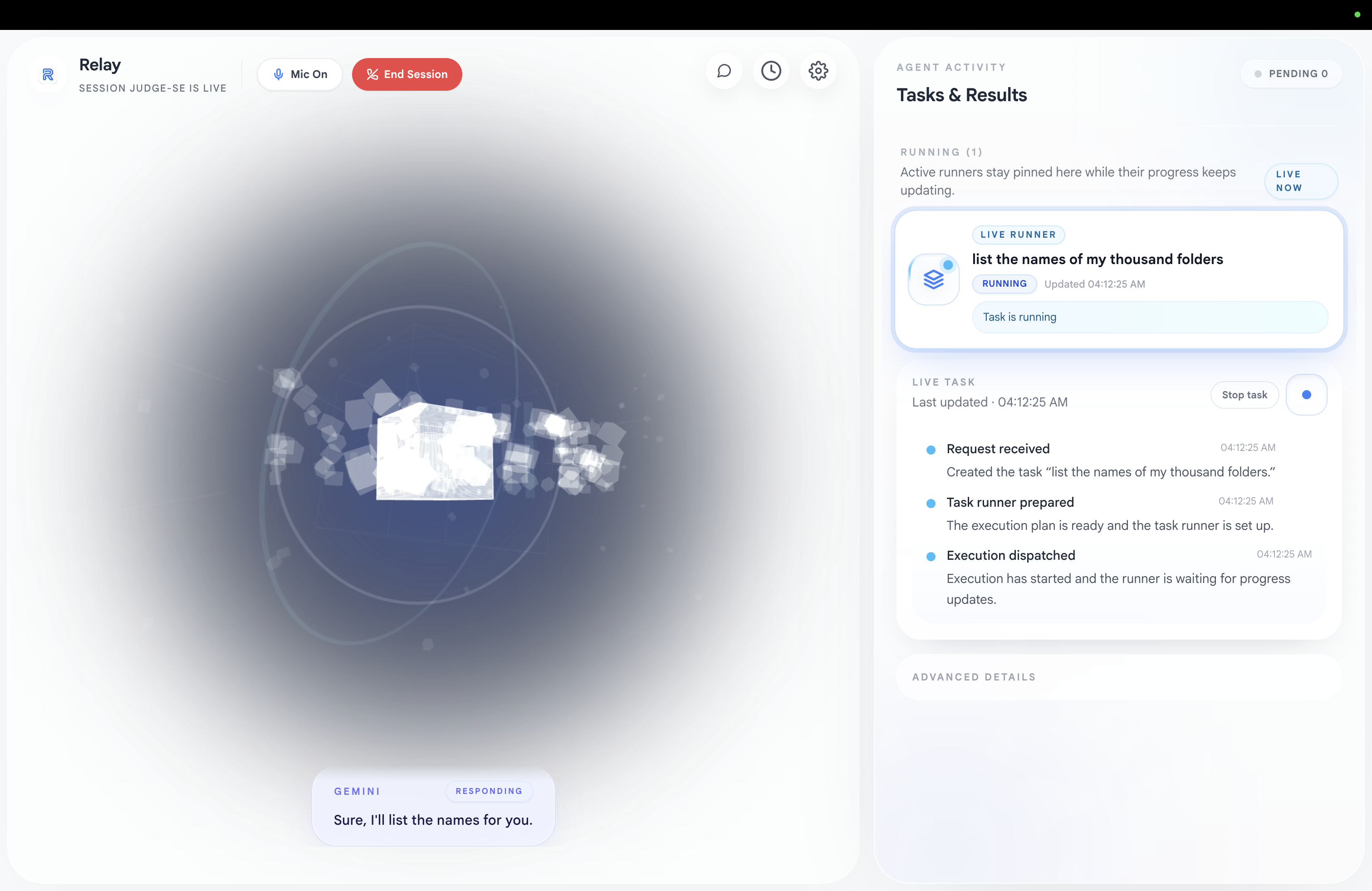 That led to Relay: a live voice agent designed for the Google ecosystem and the local desktop. Our goal was to create an experience where a user can speak naturally, interrupt mid-response, redirect work, and still receive grounded updates from a real execution path instead of a guessed answer.
