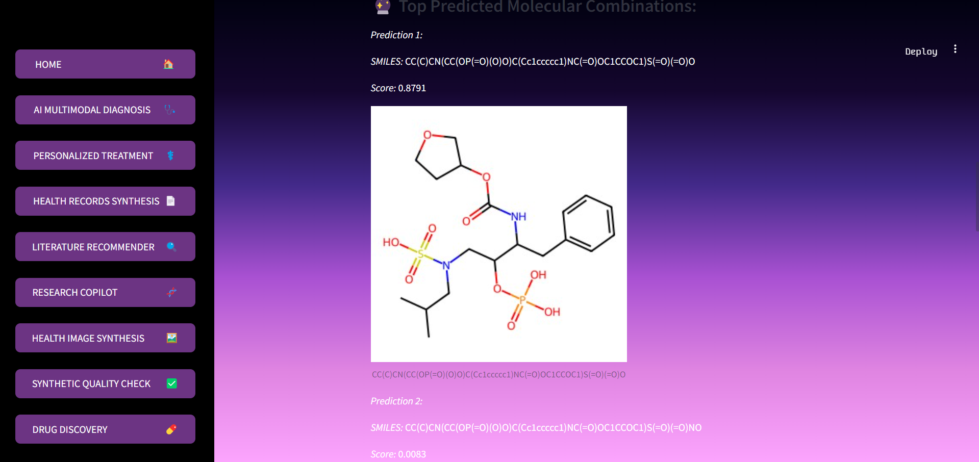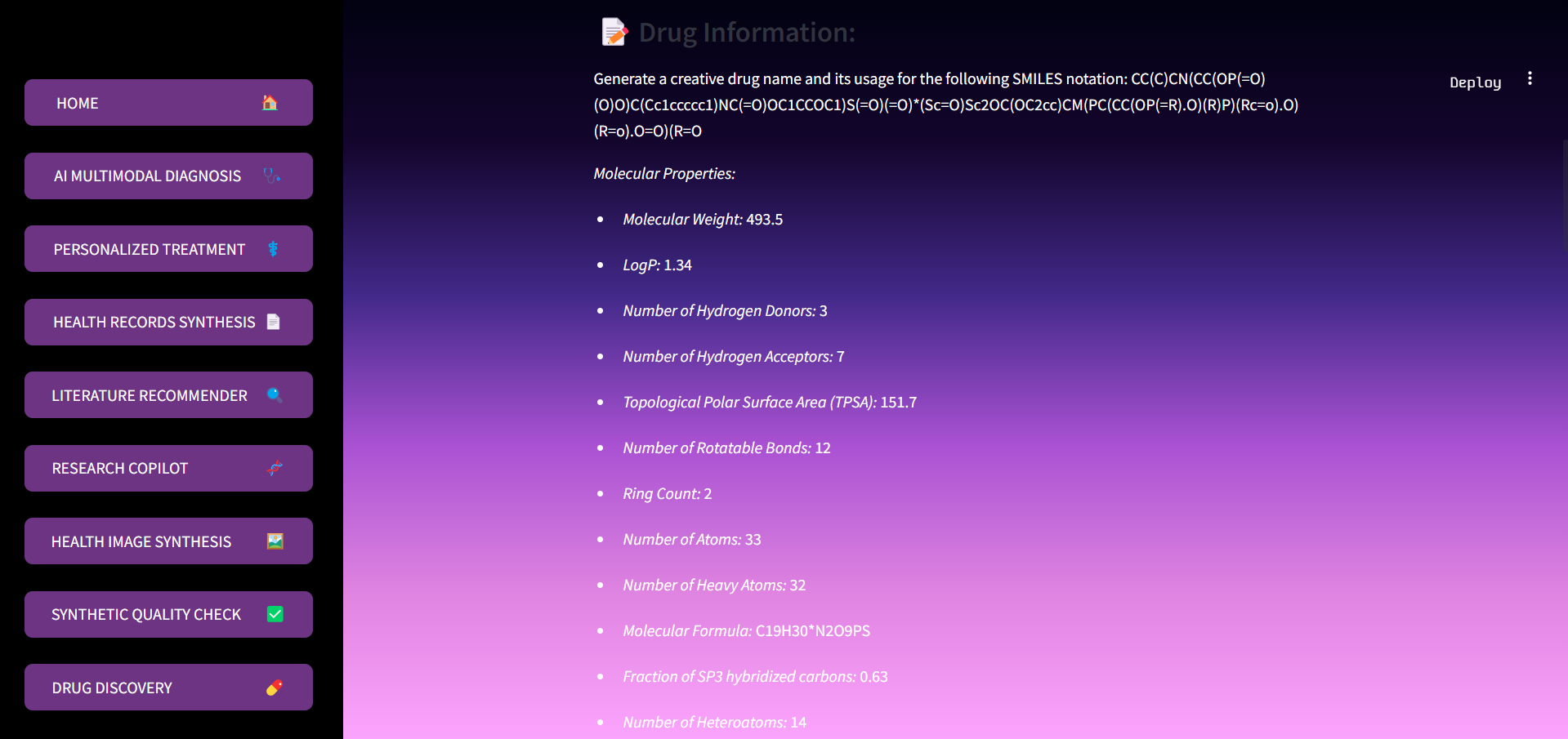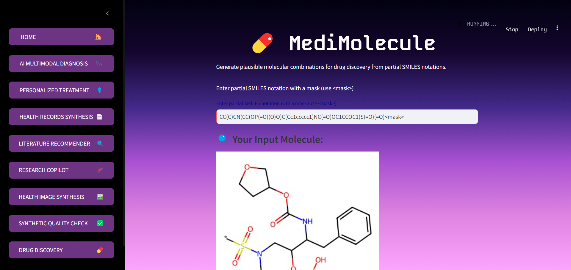 - This feature accelerates early-stage drug discovery using masked token prediction to complete SMILES sequences, suggesting plausible chemical structures. It also evaluates key molecular properties to help researchers quickly assess drug viability.