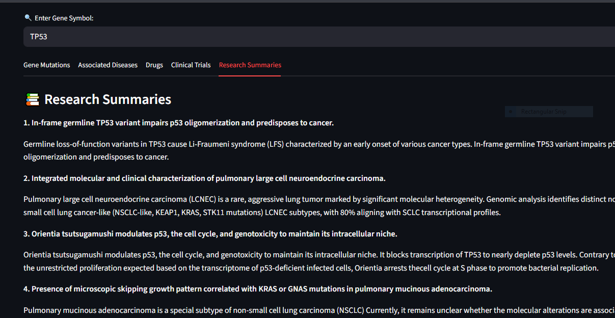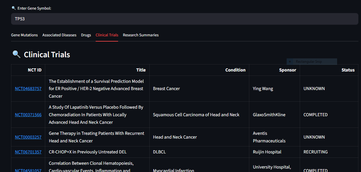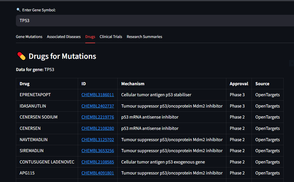 Precision medicine is revolutionizing healthcare, but researchers and clinicians often struggle to quickly connect gene mutations to clinical trials, drugs, and relevant literature. We wanted to create a tool that makes this process seamless, empowering both scientists and clinicians to accelerate discoveries and treatment decisions.