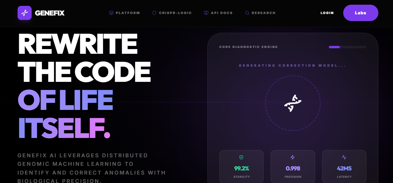GeneFix AI is an AI-powered genomic analysis platform designed for CRISPR-Cas9 research. It allows users to input DNA sequences and receive a complete analysis pipeline in return. The system identifies potential CRISPR target sites, evaluates guide RNA efficiency, detects off-target risks, and highlights mutation-prone regions. It also generates human-readable scientific summaries and correction strategies using generative AI. The platform transforms raw genomic data into structured insights that can support real research decisions.