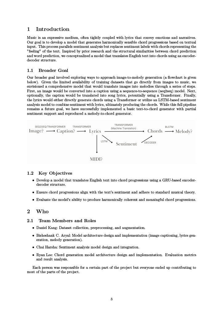In this project, we created a text-to-chord generation model that translates English text into a sequence of harmonically coherent chords using an encoder-decoder architecture. The model leverages GRU layers and embedding representations to learn relationships between text and chords. Our approach utilizes the Guitar Resource chord-lyric dataset, comprising 500 songs, to train the model. Despite challenges like limited annotated data and chord representation complexity, the model demonstrates promising results in producing chord progressions that align with the sentiment of the lyrics.