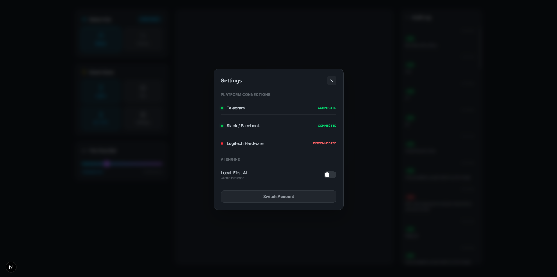 Backend: Node.js + Express server handling webhooks, with a WebSocket layer that differentiates between dashboard clients and hardware clients using URL parameters. AI Pipeline: LangChain.js with dual-mode support — OpenAI GPT-4o-mini (cloud) or Ollama llama3 (local), switchable at runtime from the dashboard. Dashboard: Next.js 16 with a dark cyberpunk-industrial 3-column layout built with Framer Motion animations and Tailwind CSS v4. Logitech Plugin: C# / .NET 8 plugin using the Loupedeck SDK, with modules for HapticEngine (6 waveform patterns), PersonaManager (3 AI personas), ToneDial (maps dial rotation to AI temperature), and bridges for messaging and smart home. Hardware Simulator: A Node.js script that mimics the C# plugin, connecting as a hardware client to prove bidirectional communication without a physical device. Persistence: SQLite for local-first storage. Sessions and redacted messages are stored locally — no cloud dependency. Tunnel: ngrok exposes the local webhook publicly for Unipile callbacks.
