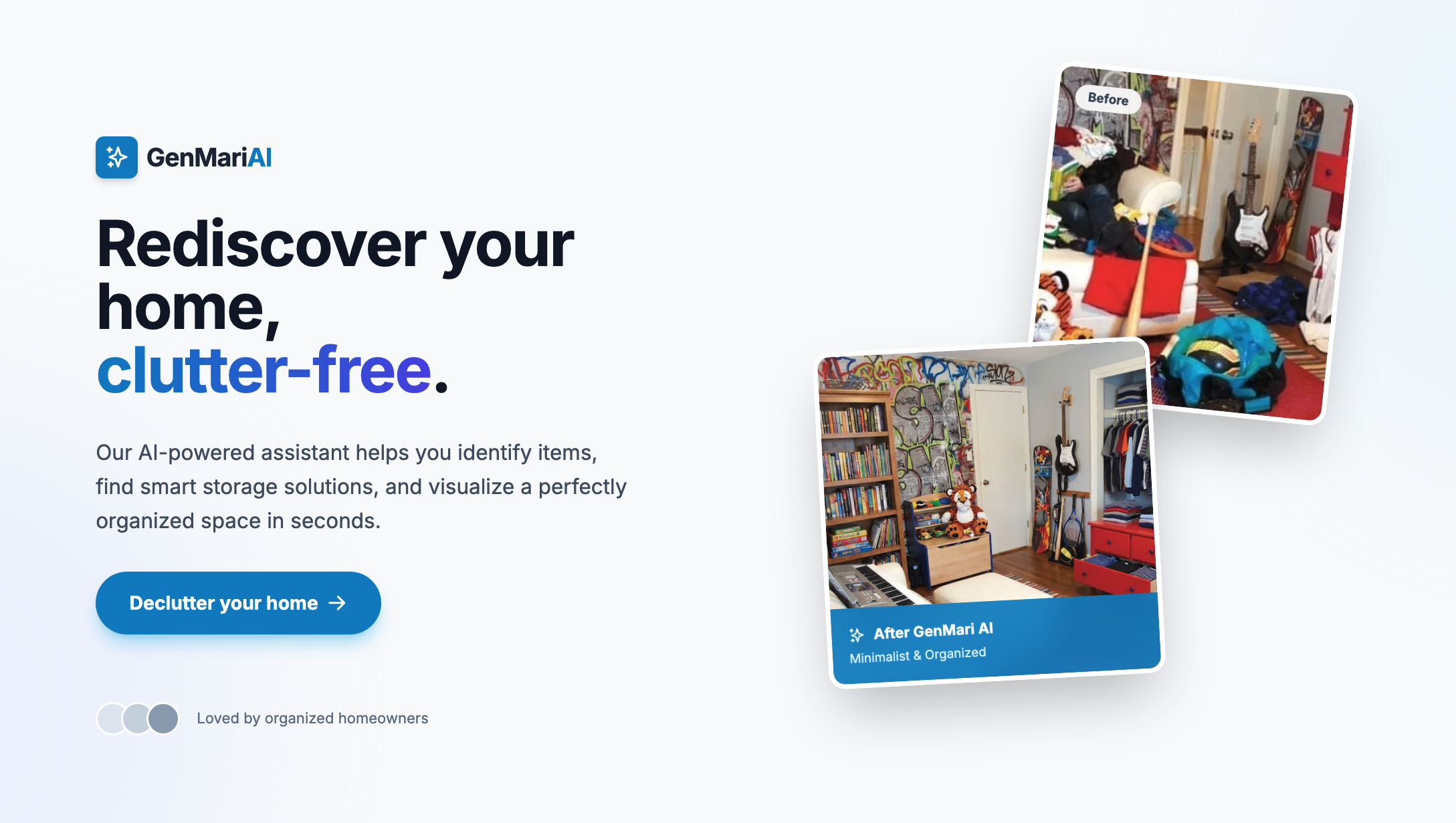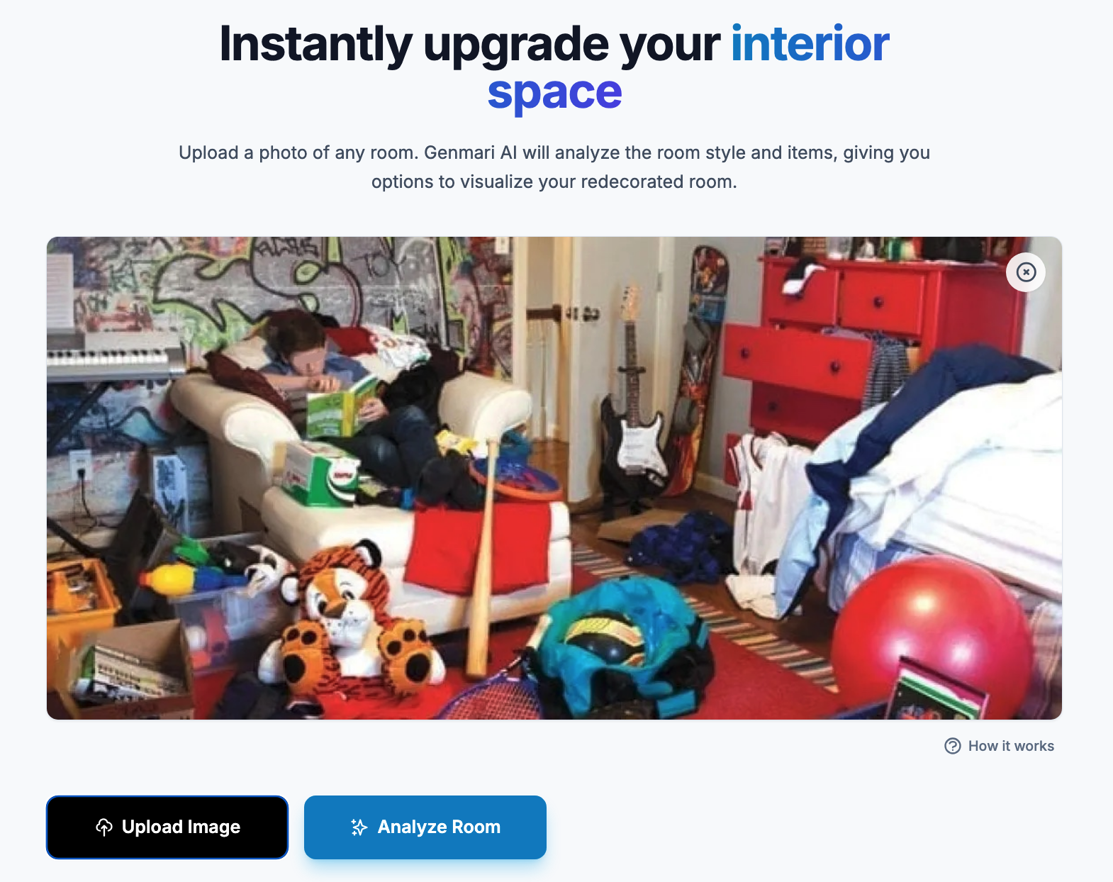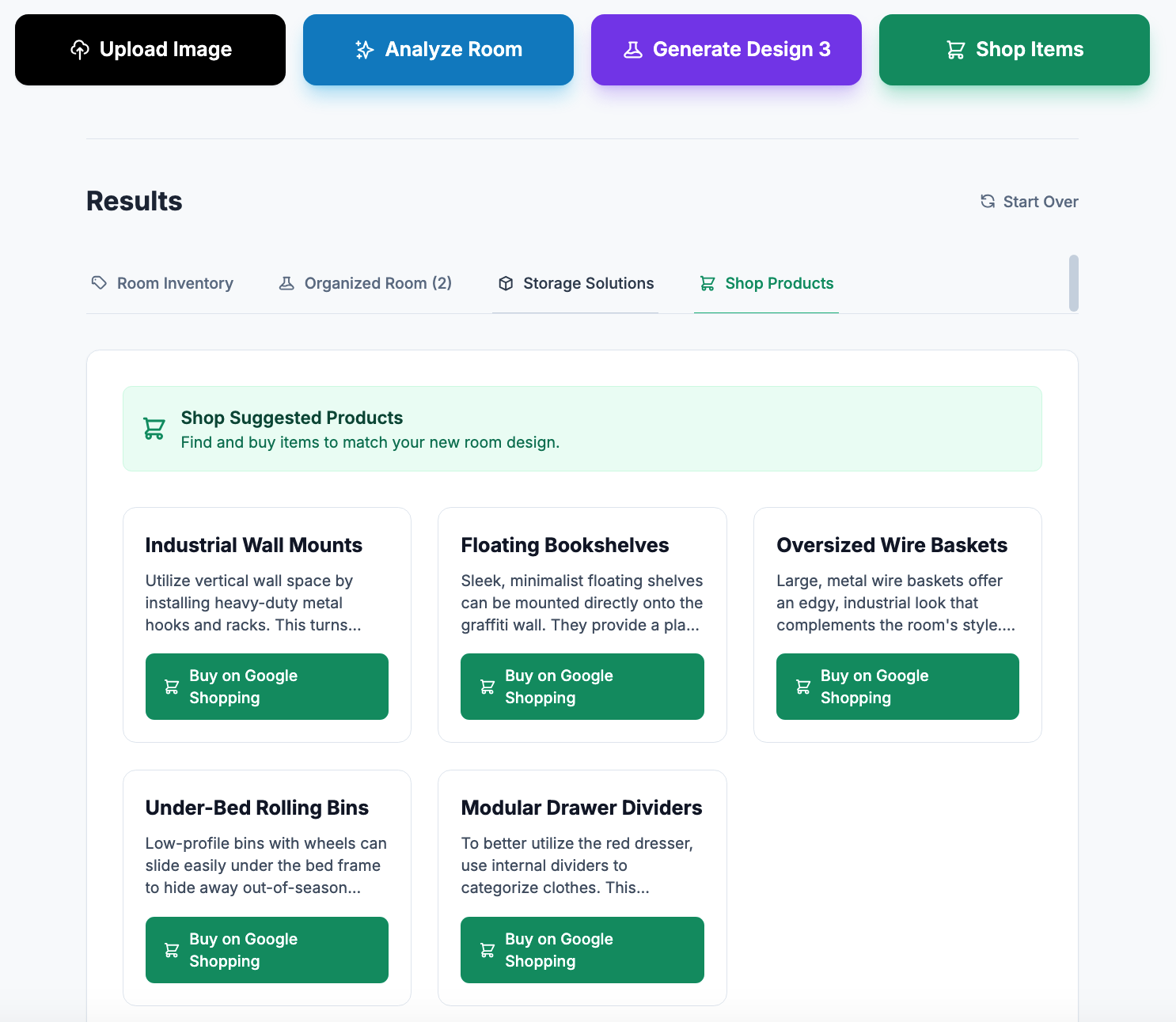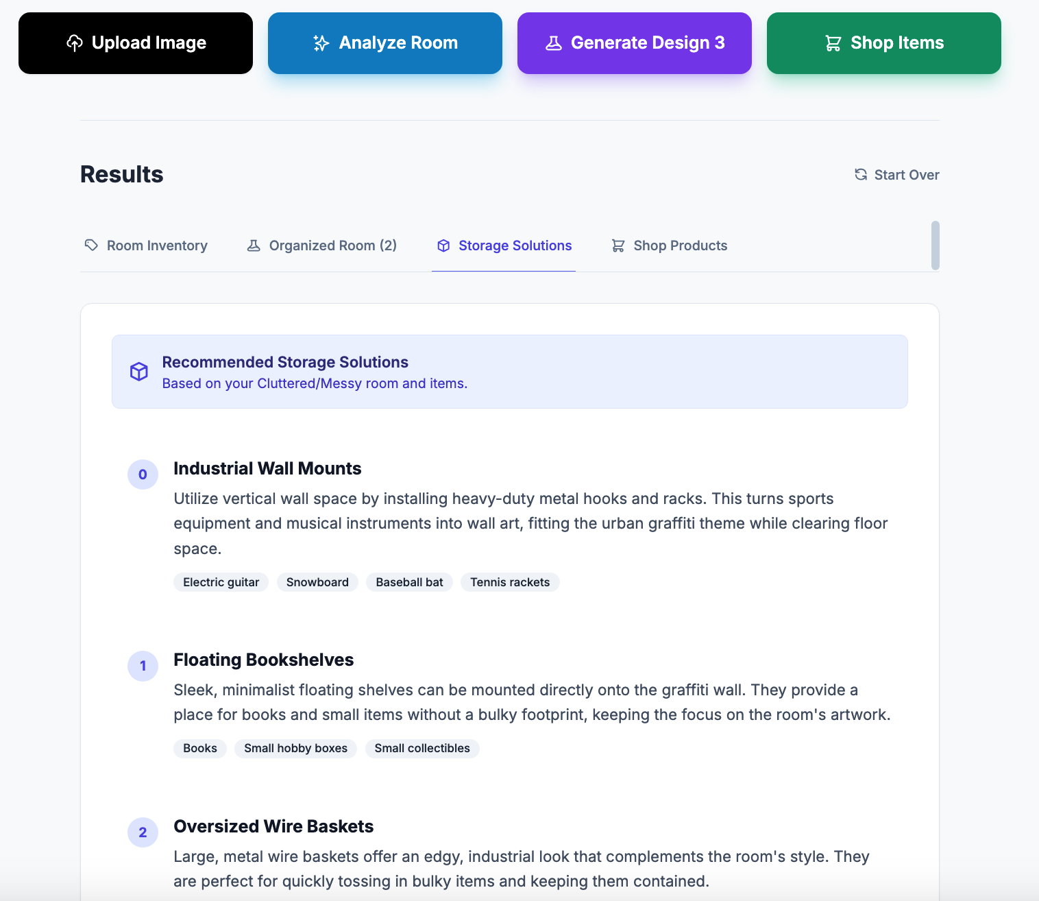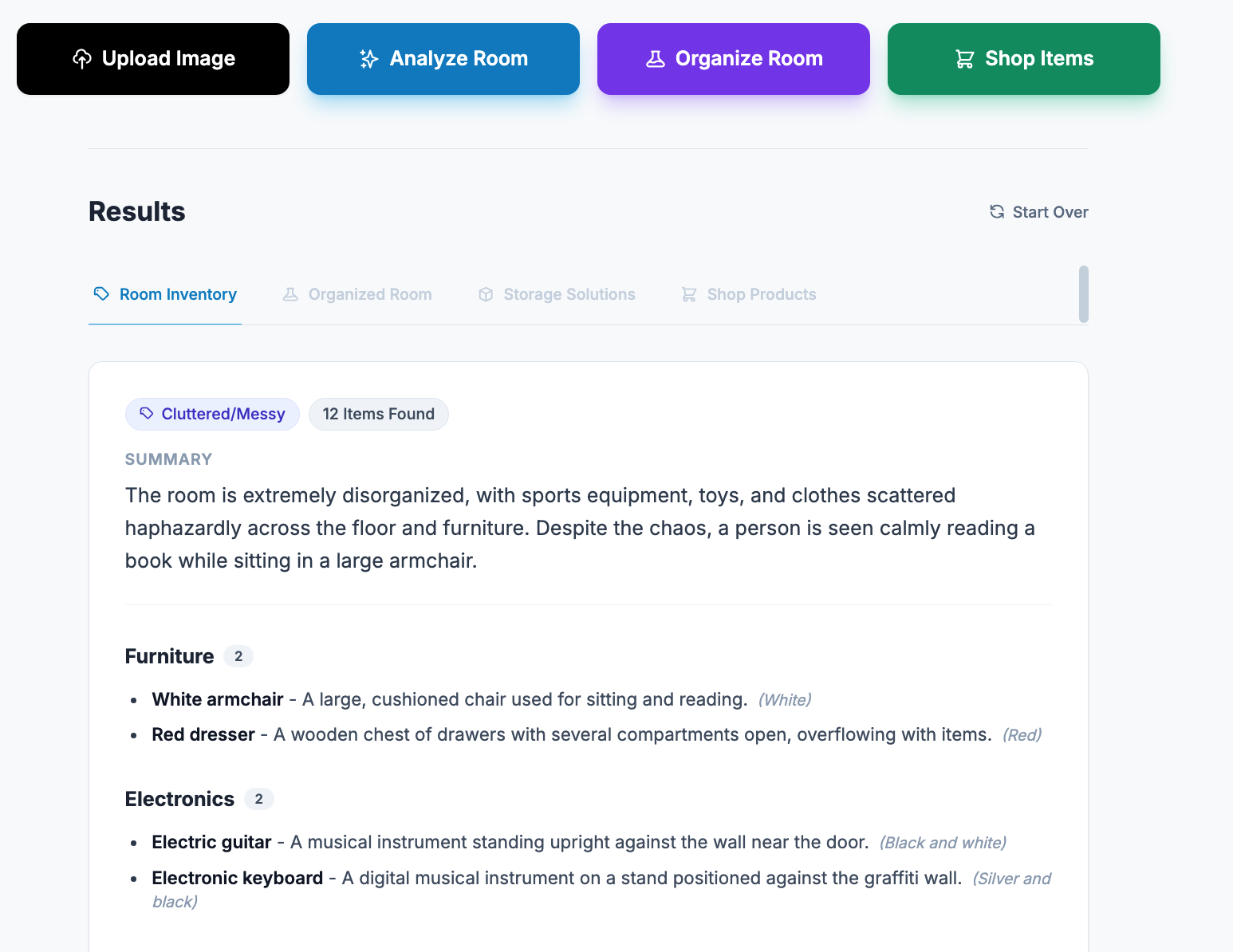The web app allows a user to upload an image of a room that requires decluttering. After verification that the image is a room that needs decluttering, the app lists the items in the room. The next step is to list storage solutions for the room. The final step is visualization of the decluttered room.