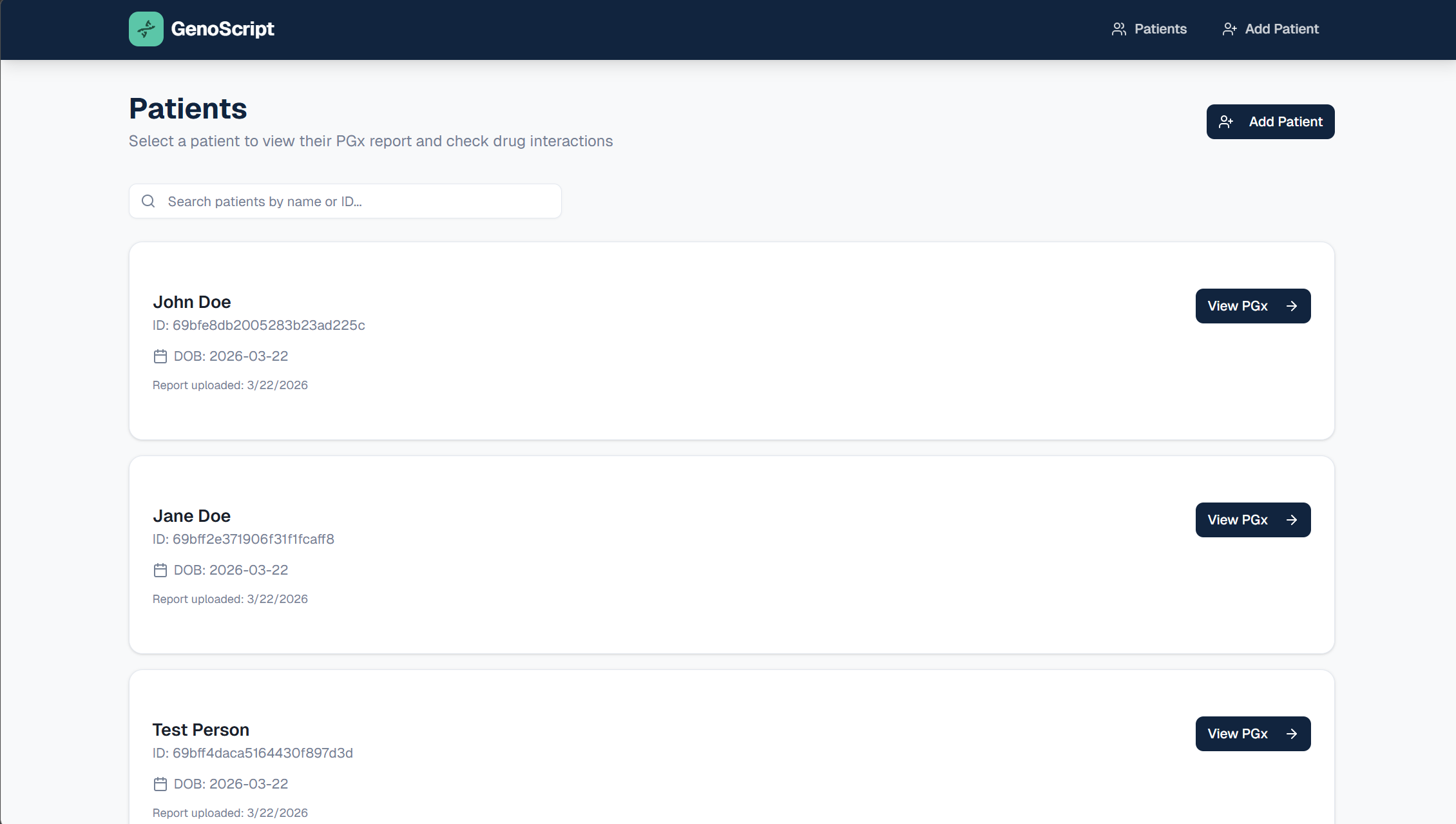 - MongoDB for storing patient data and PGx results