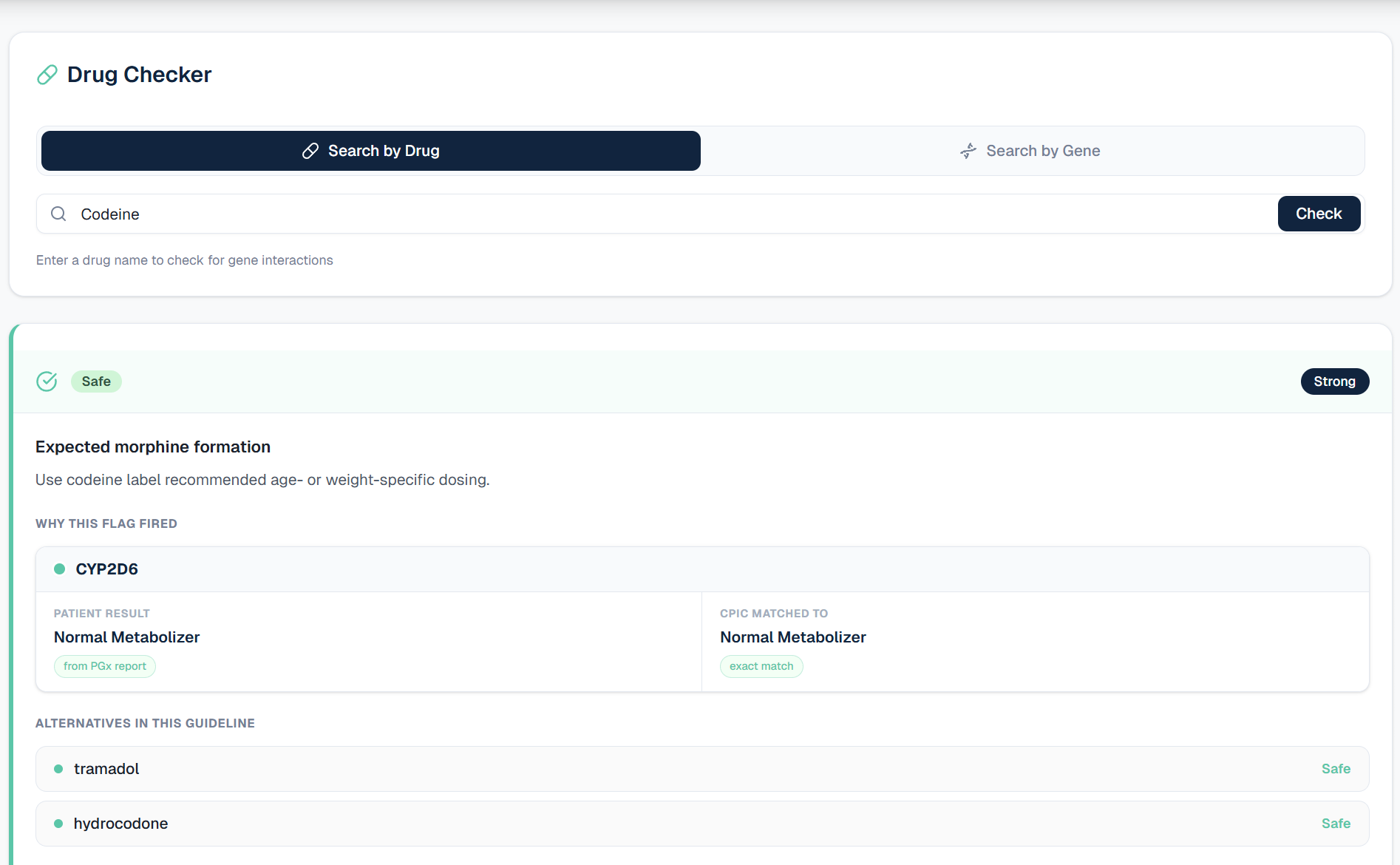 - Displays risk levels using intuitive severity flags (red, yellow, green) This enables providers to make faster, more informed prescribing decisions tailored to each patient’s genetic profile.