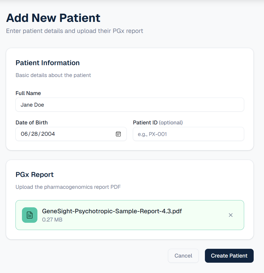 - Parsing unstructured PGx reports: Reports vary widely in format, requiring robust AI-based extraction prompts to standardize gene-phenotype data