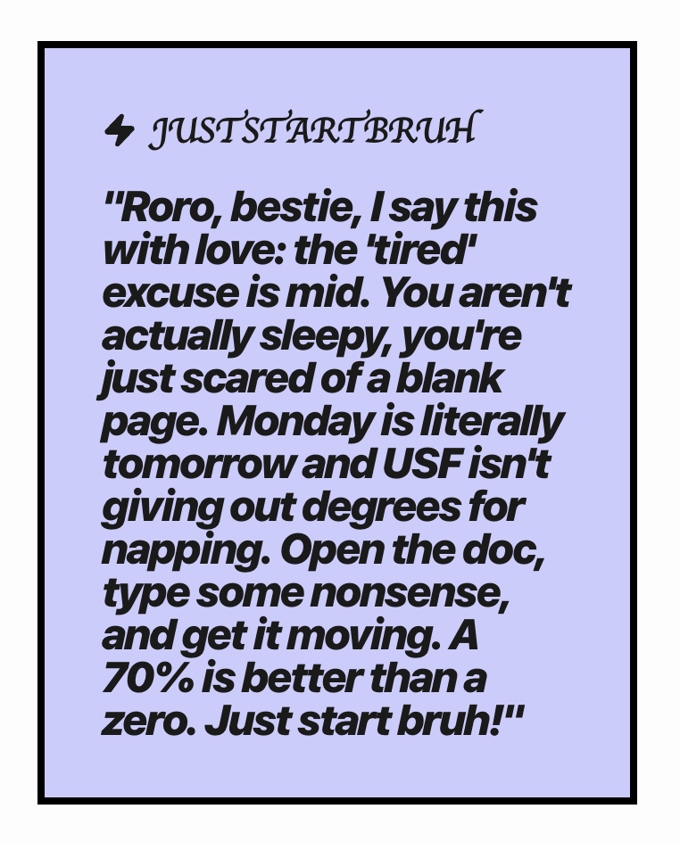 Users input basic and session-specific info (like mood, urgency, and task type). The AI analyzes this to identify their procrastination pattern and delivers “toxic” motivation to push them into action.