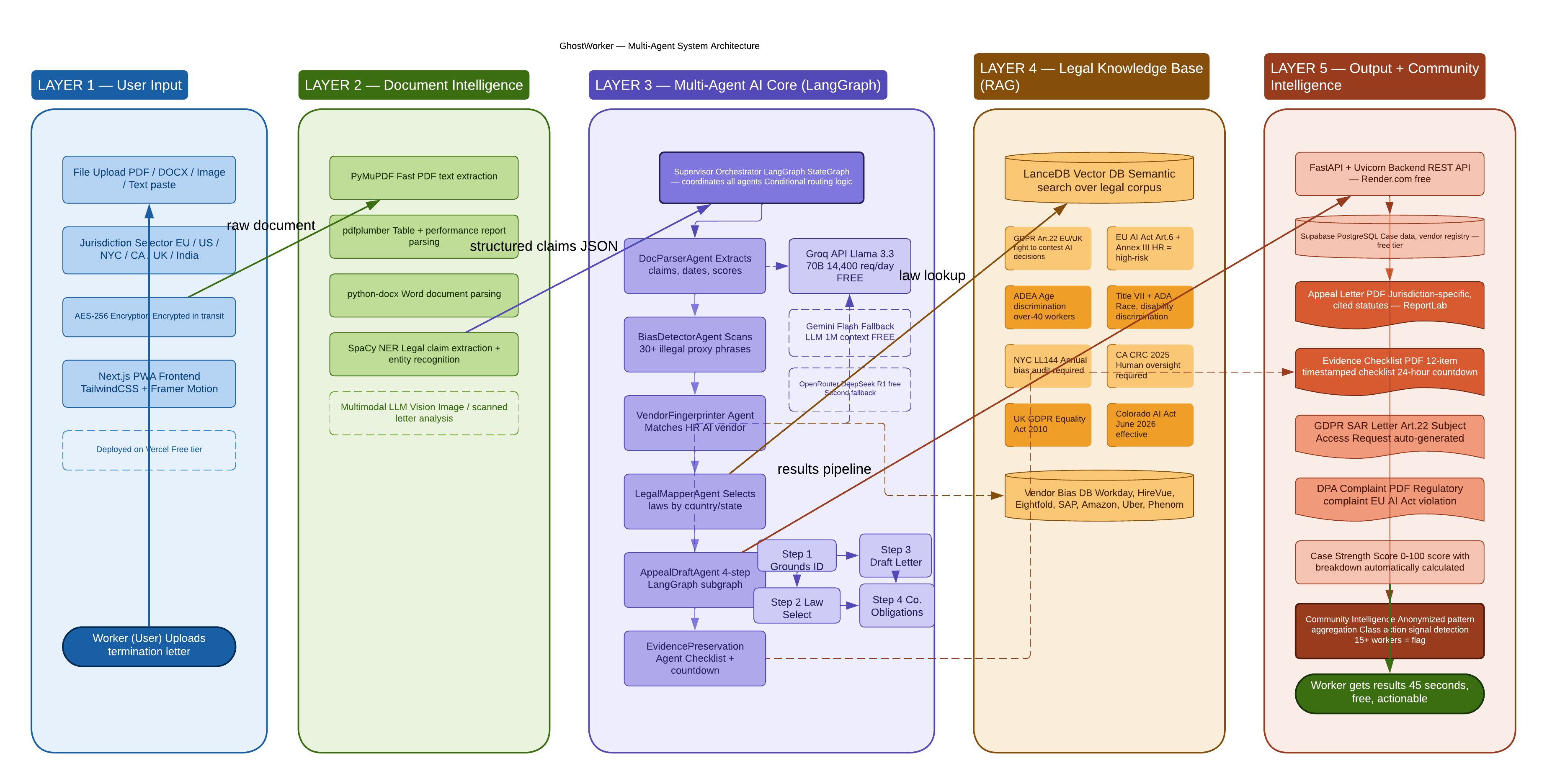 A ready-to-send legal appeal letter (F-04) A 4-step LangGraph agent pipeline: identifies the two strongest legal grounds → selects applicable laws by jurisdiction → drafts a formal letter with specific statute citations → adds what the company was legally required to do and failed to do. Full letter downloads as PDF. For EU: GDPR Article 22 + EU AI Act Article 6. For US: ADEA, Title VII, ADA, NYC Local Law 144, California CRC 2025. For UK: UK GDPR + Equality Act 2010. A lawyer charges $300–500 to write this. GhostWorker does it in 45 seconds for free.
