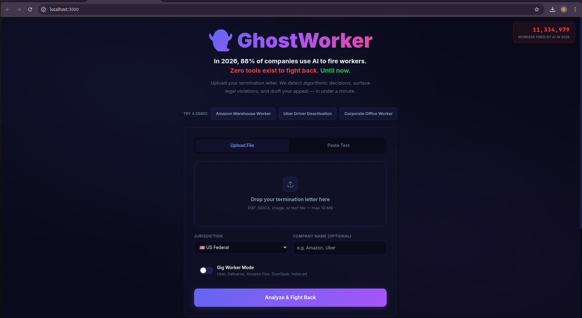 Voice input — a lot of gig workers can't type or upload files. Whisper API, any language, describe your situation verbally, GhostWorker extracts the relevant facts and builds the case. The rights belong to every worker, not just the ones who can navigate a file upload.