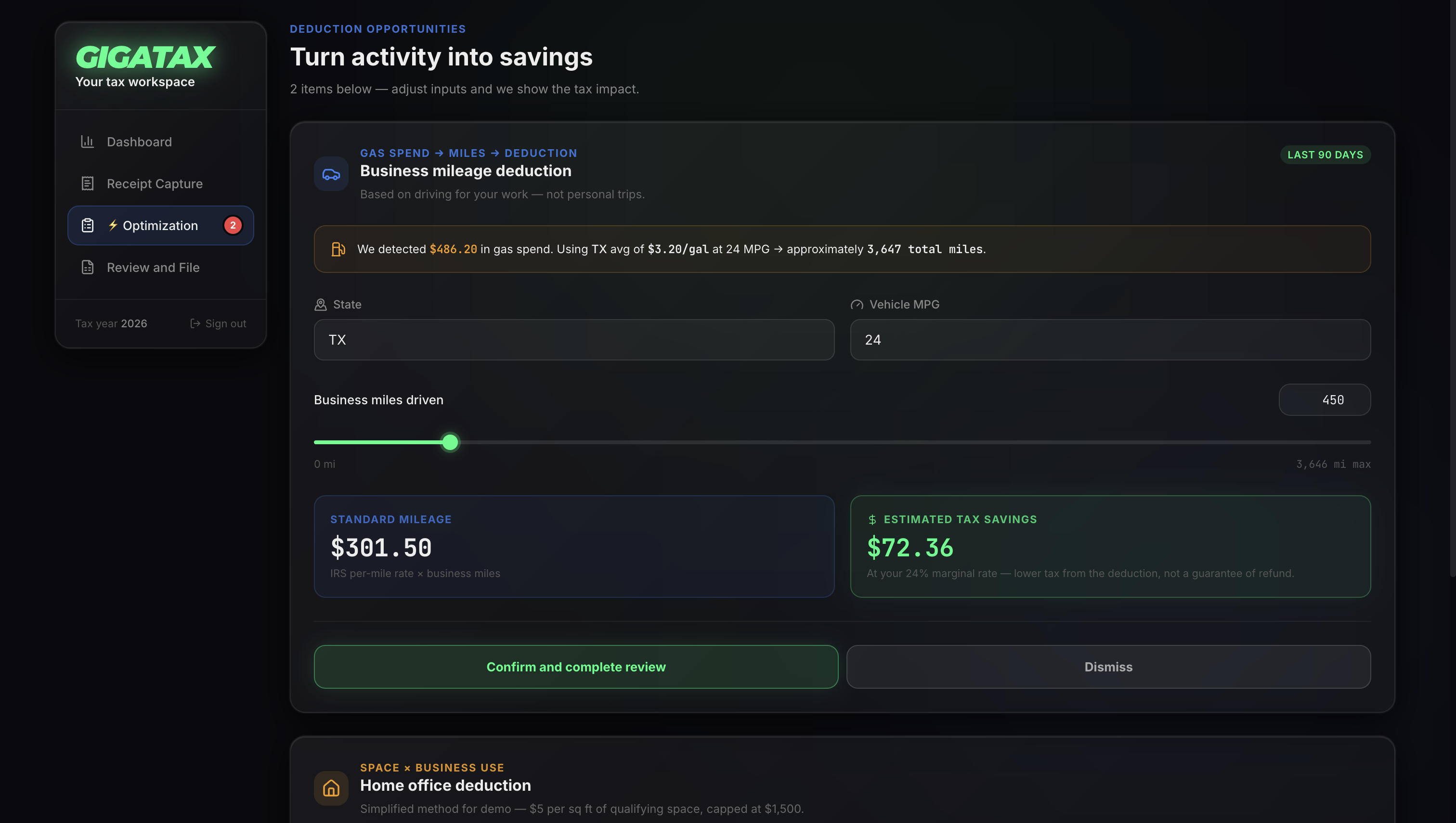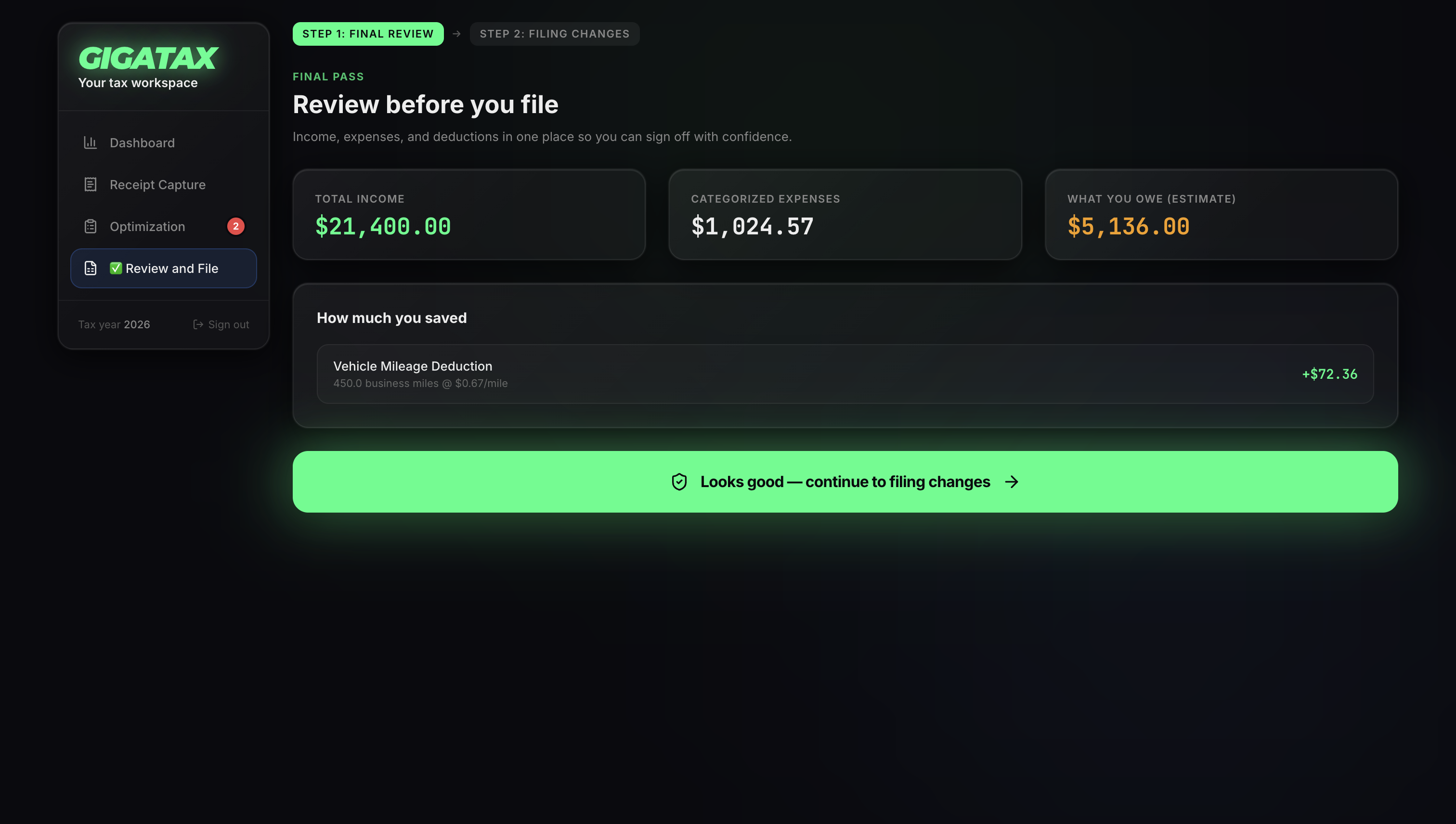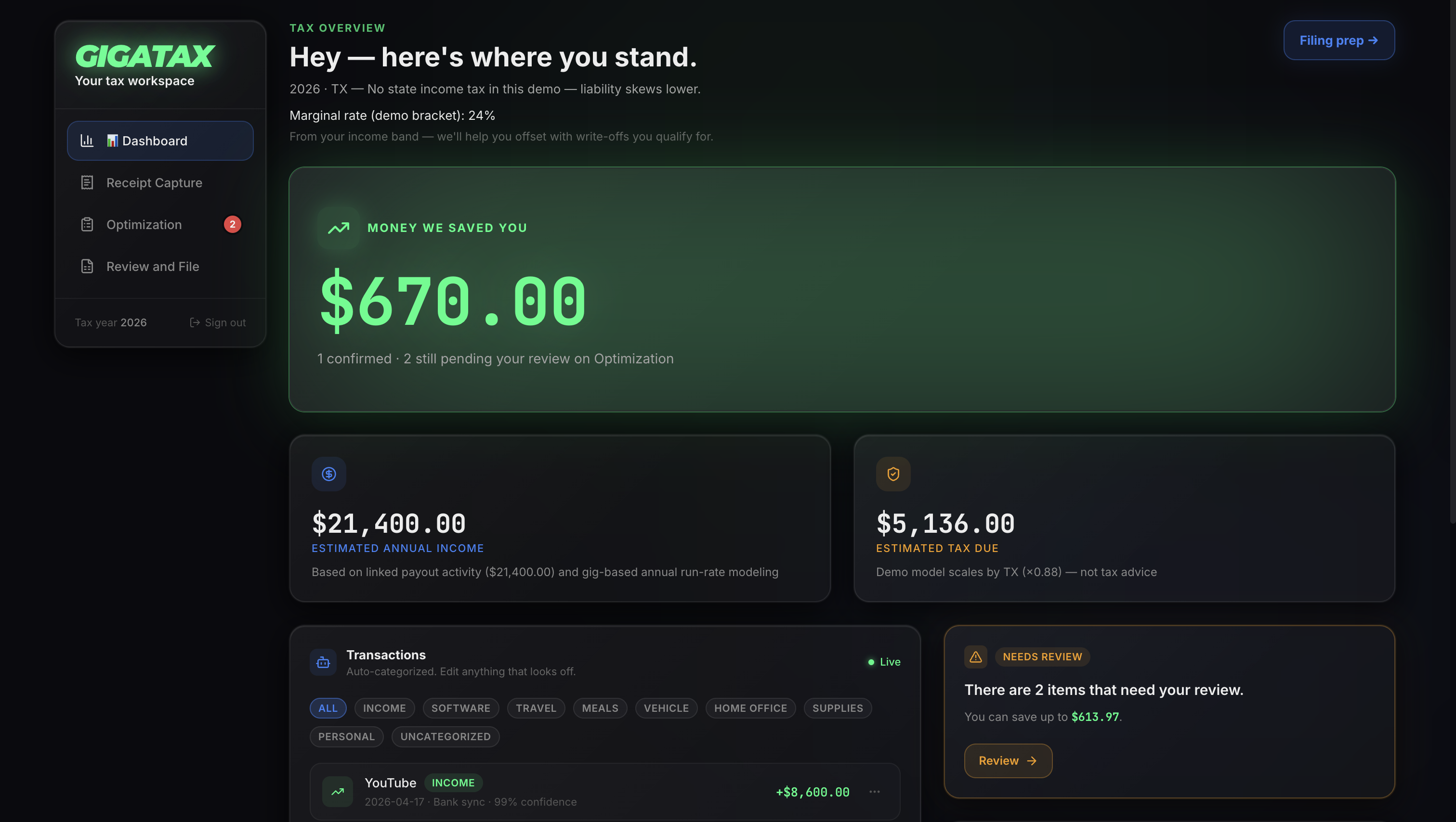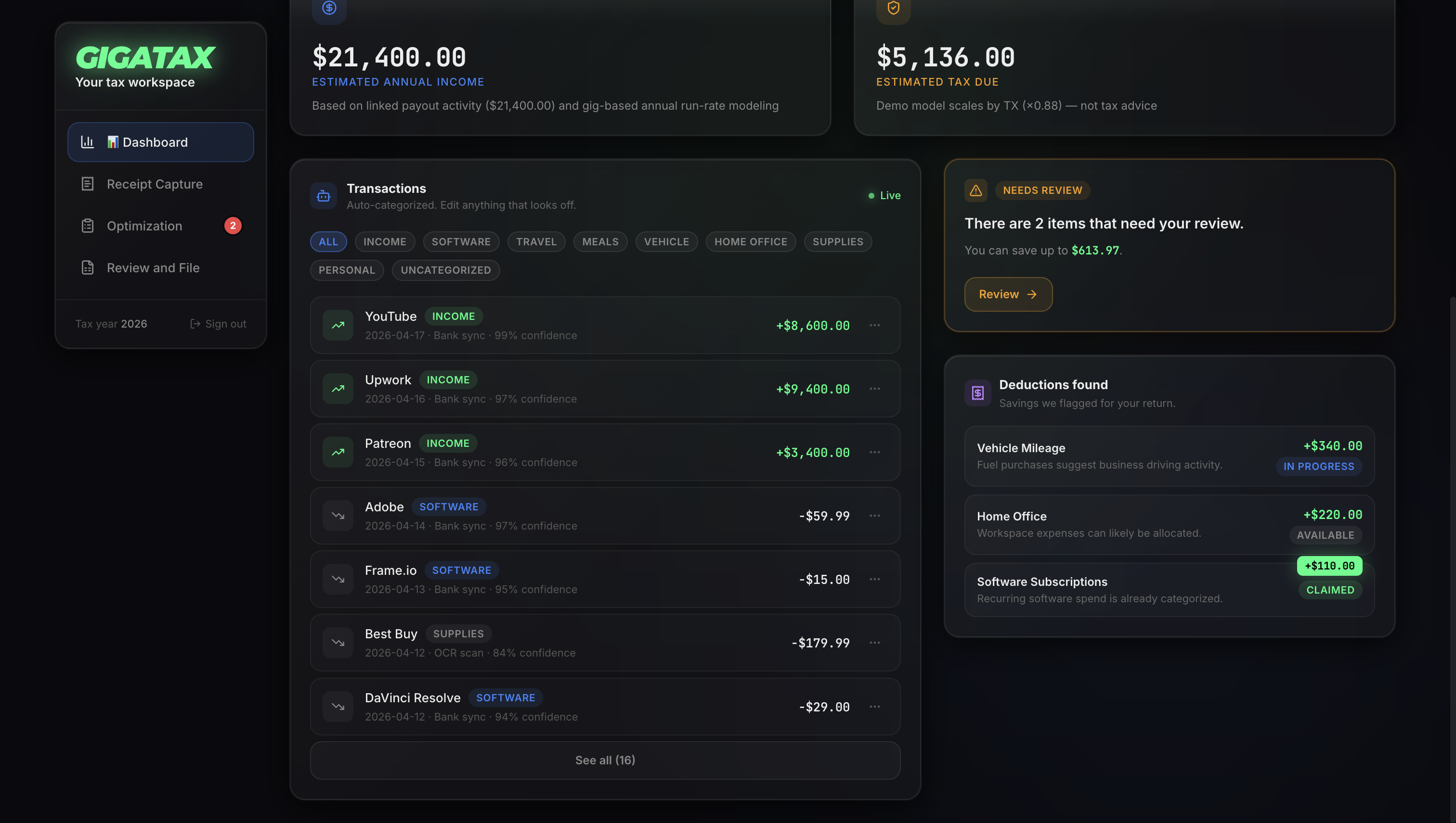 We used React on the frontend and Python with FastAPI on the backend, with Supabase handling our database, authentication, and file storage. The intelligence behind GigaTax runs on Claude Sonnet 4.6 via the Anthropic SDK. When a transaction comes in, Claude reads the merchant, amount, and the user's gig type together to categorize it, score its confidence, and determine deductibility in a single pass. The same model powers our receipt scanner, reading actual image and PDF files through Claude's vision API to extract the data automatically. We also built a deduction discovery layer that runs across a user's full transaction history and surfaces profession-specific write-offs they would have otherwise missed. Bank connections are handled through Plaid, and the entire experience is tied together with Google OAuth and real-time dashboard updates so users always see the live tax impact of every transaction.