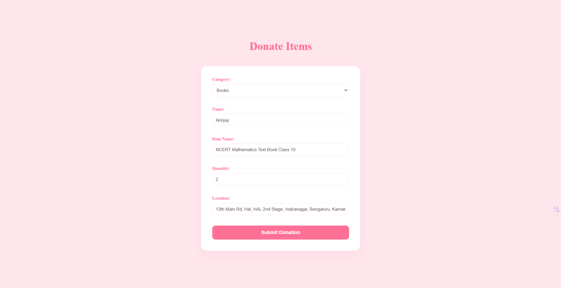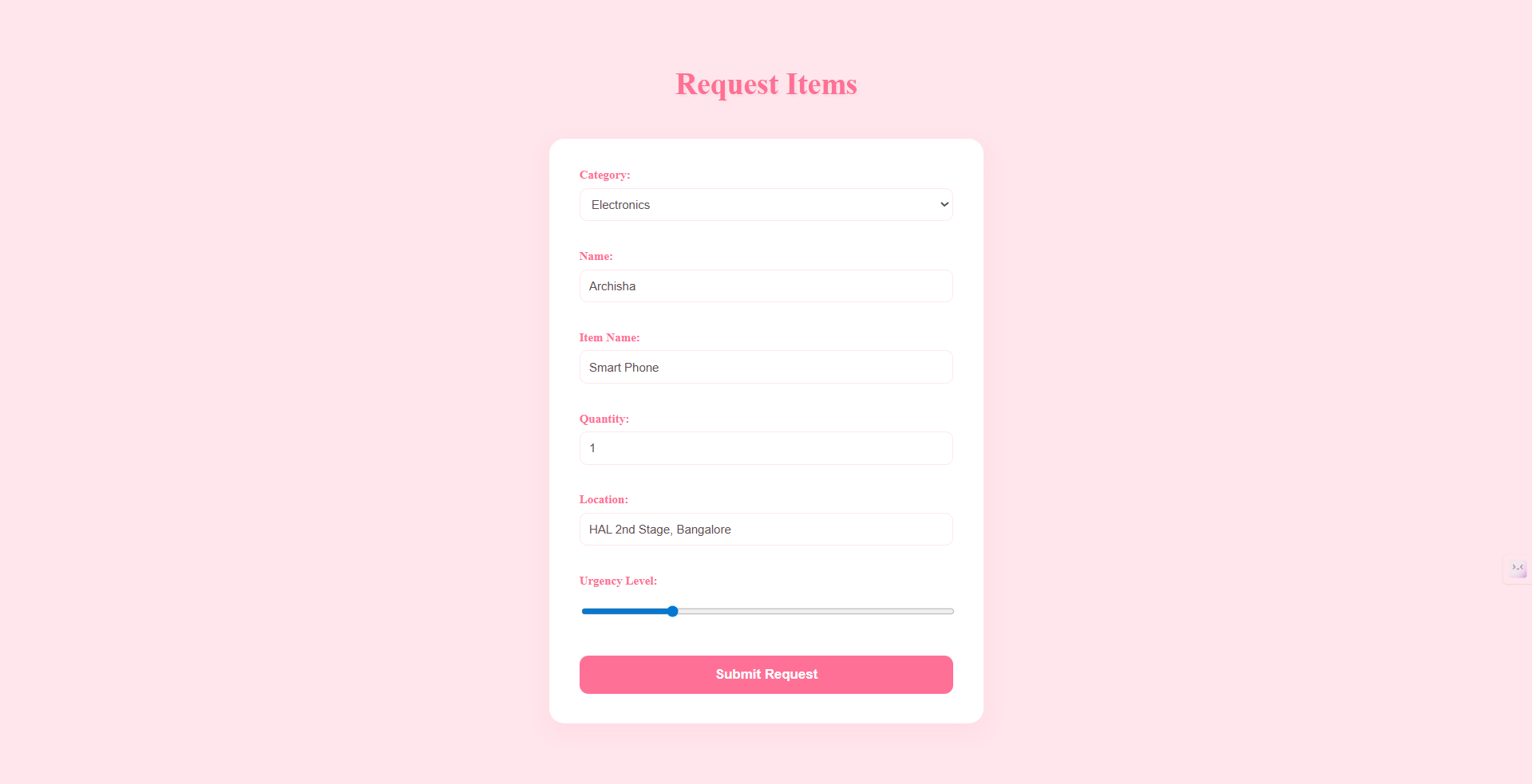 - Frontend: Django templates with custom HTML/CSS and two core flows: a Request Items form and a Donate Items form. Request Items comes with an urgency score slider.