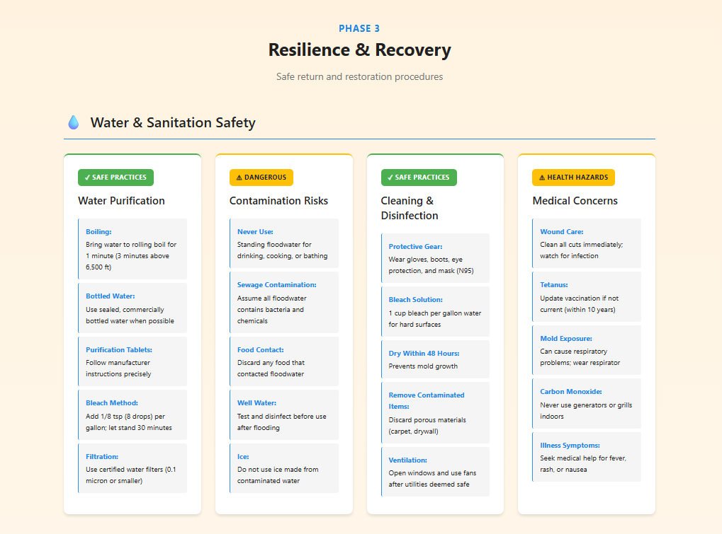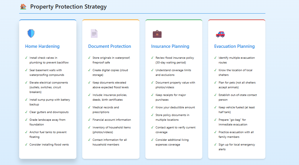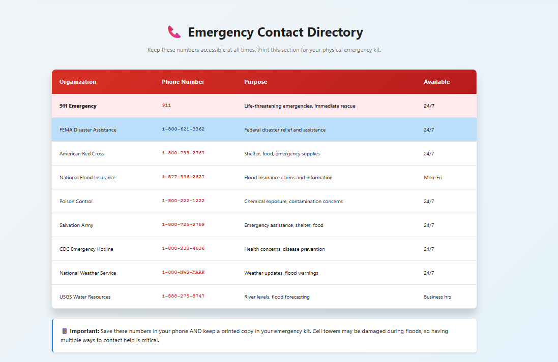 The application includes dynamic checklists that allow users to track their progress and visualize their readiness through a real-time preparedness score. It also features a flood depth danger visualizer to help users better understand risk levels, along with quick access to emergency contacts. The interface is fully responsive, supports dark mode, and is optimized for both mobile use and printing, ensuring accessibility in real-world situations.