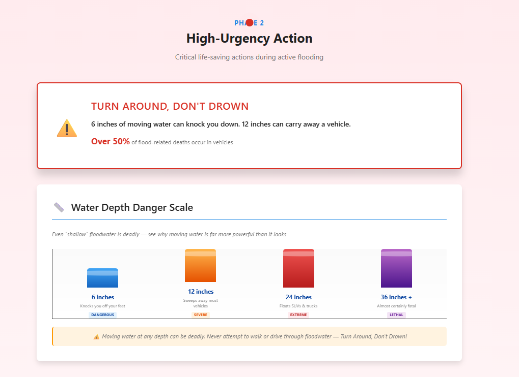 Flood Safety Guide is an interactive preparedness web application designed to guide users through every stage of a flood emergency. Instead of presenting information as large blocks of text, the platform organizes critical actions into three clear phases—before, during, and after a flood—so users can quickly understand what steps to take.