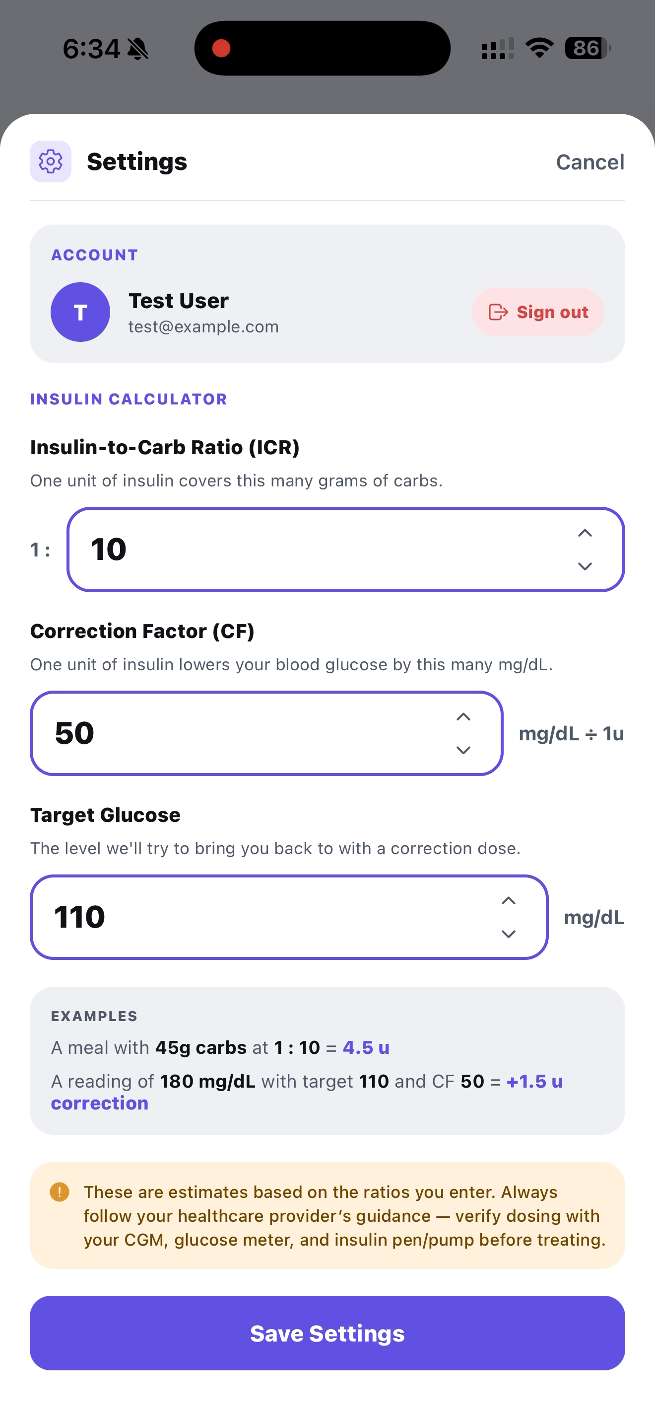 - Suggest a bolus — uses the user's insulin-to-carb ratio to recommend dosing.