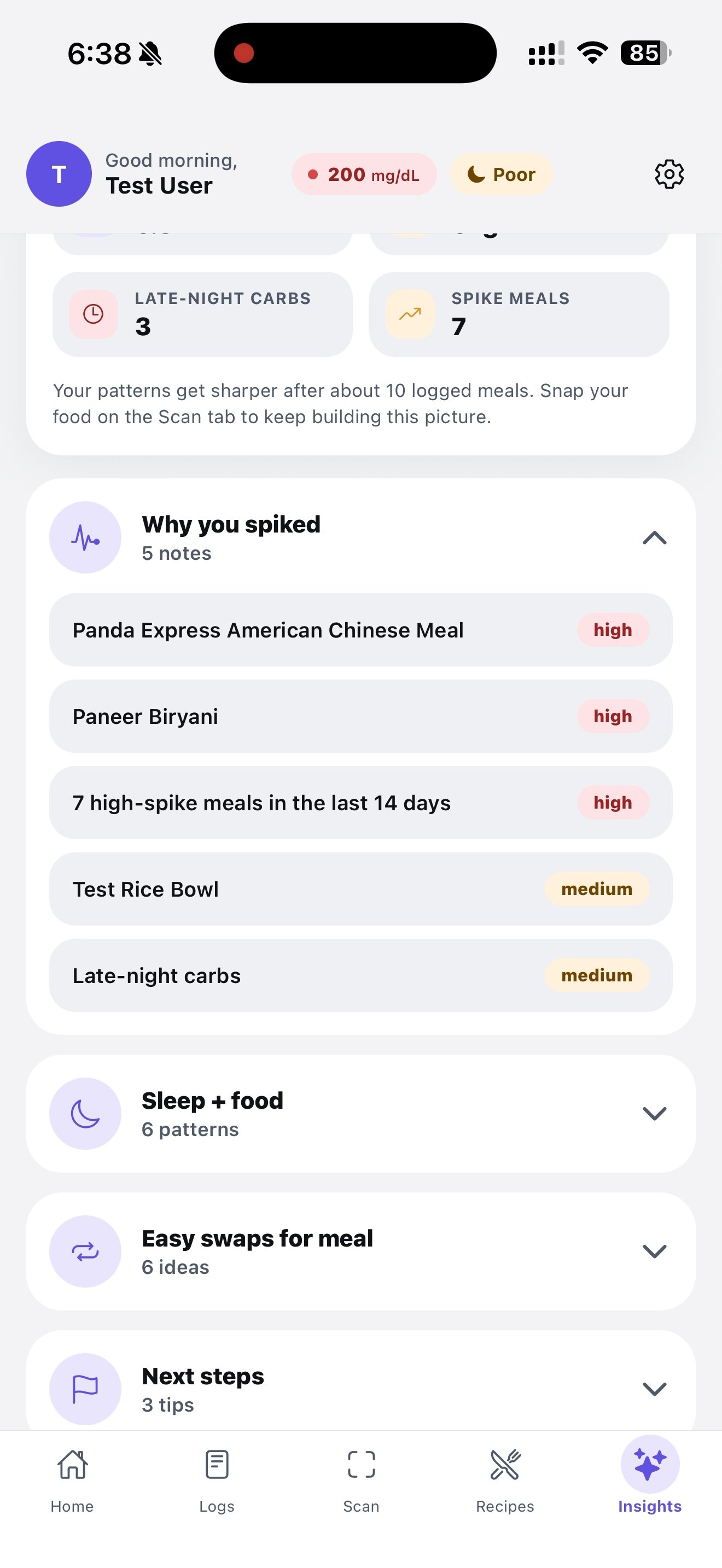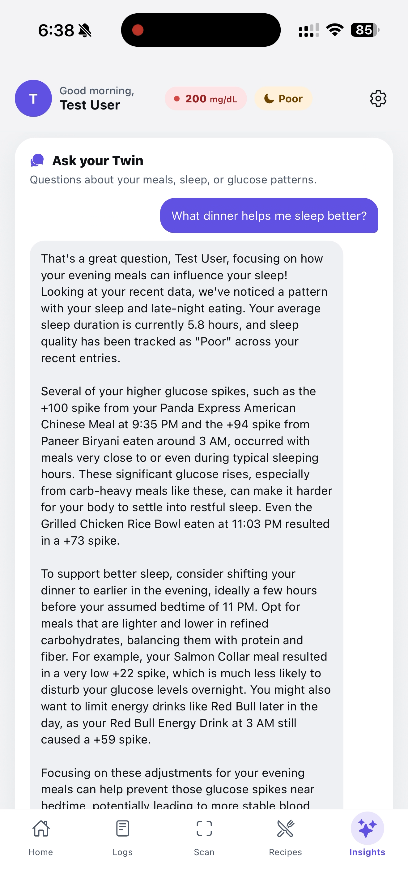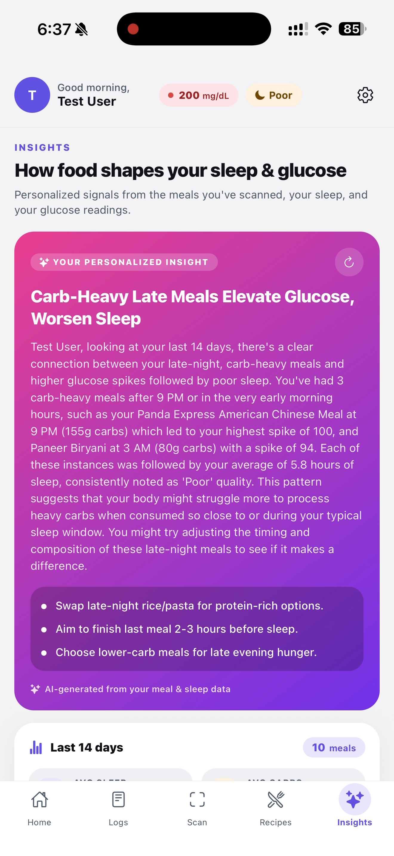 - A genuinely useful AI insight that says things like "Your Panda Express meal at 9 PM (155g carbs, spike 100) is correlating with your 5.8h sleep nights" — not generic advice, the user's actual data.