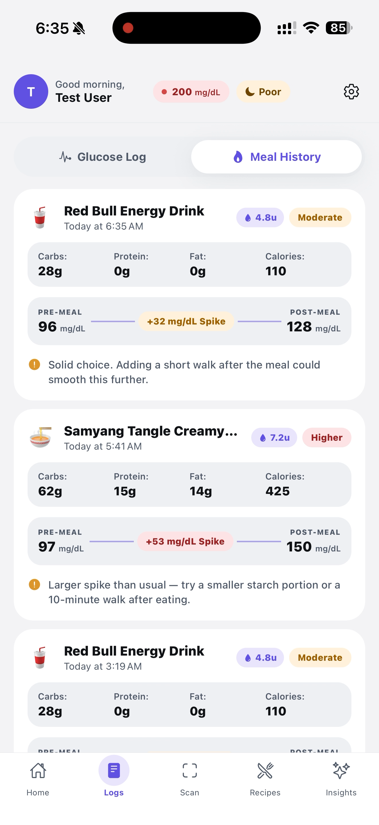 - Real CGM integration (Dexcom, Libre) to replace mocked spike curves with actual continuous traces.